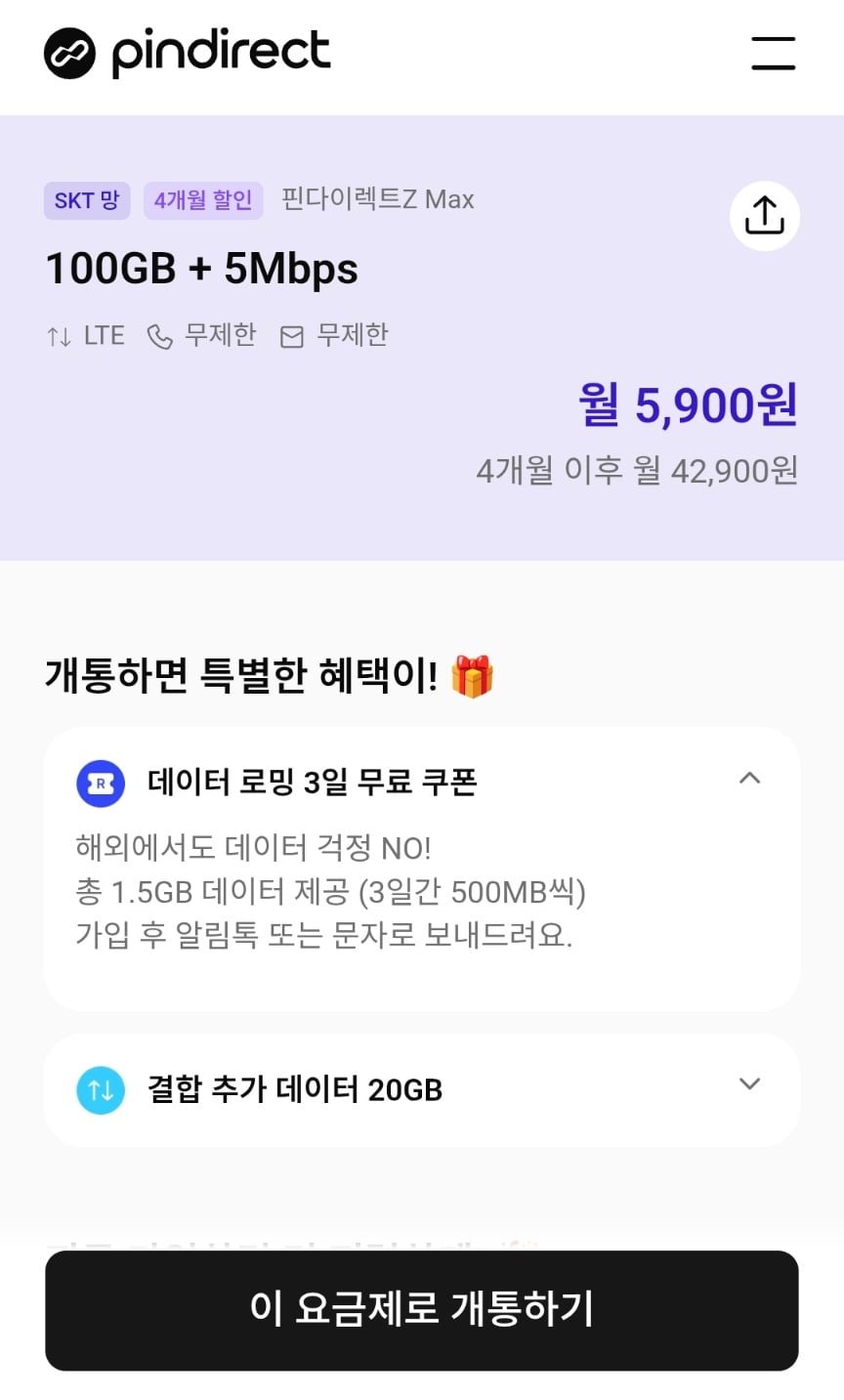 [핀다이렉트]알뜰폰 SK망 100기가 5900원 외 1개 4개월 / KT망 10000원 5개월 (다양/무료)