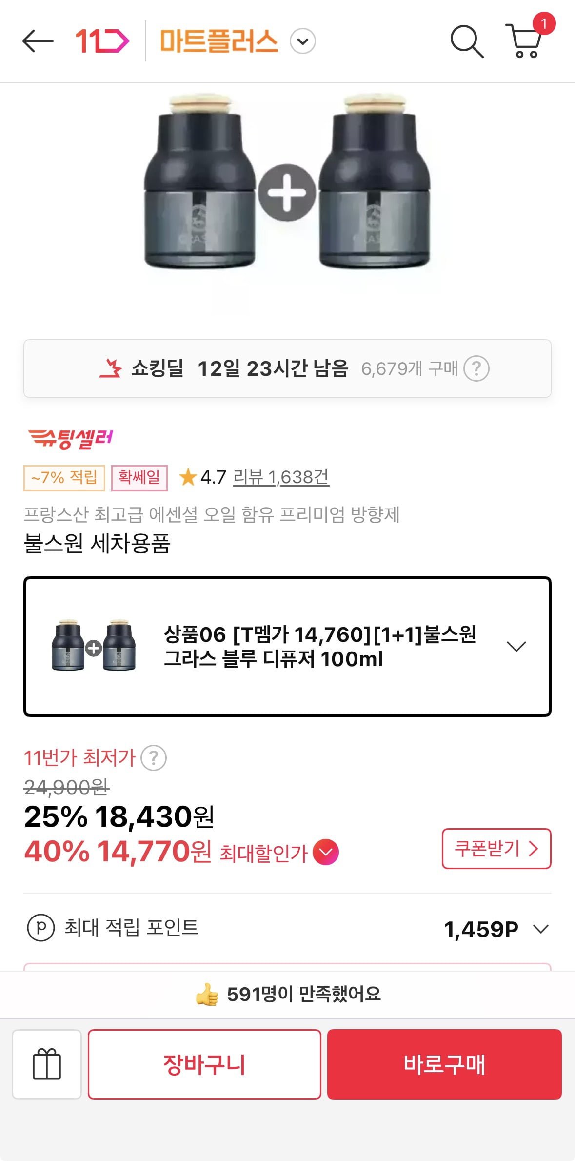 [11번가][1+1]불스원 그라스 블루 디퓨저 100ml(16,590원/무배)