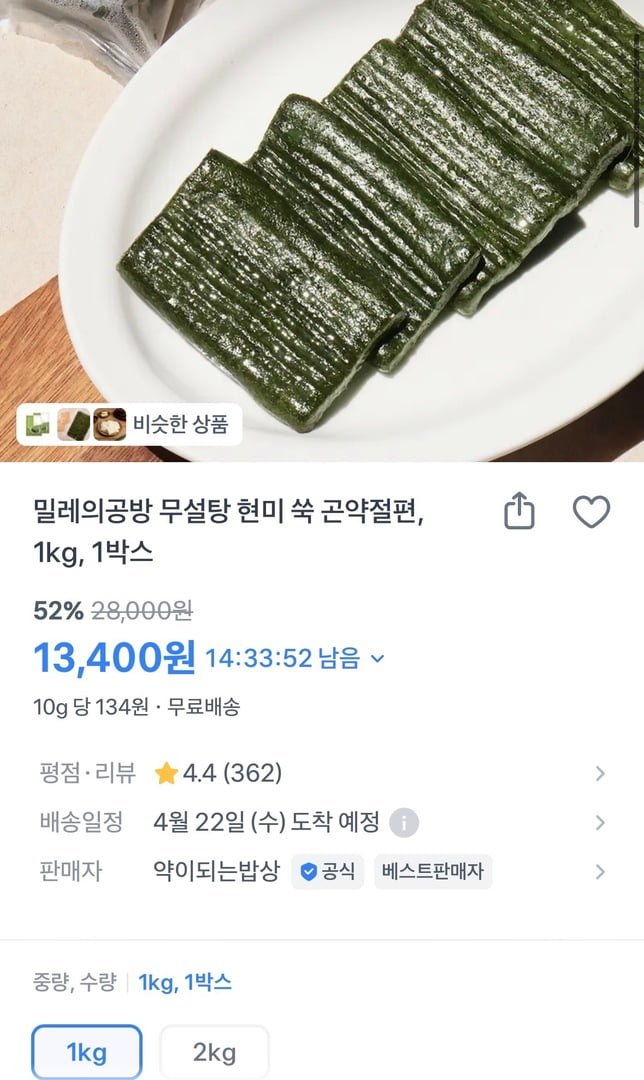 [토스]무설탕 현미 쑥 곤약절편 1kg (13,400원/무료)
