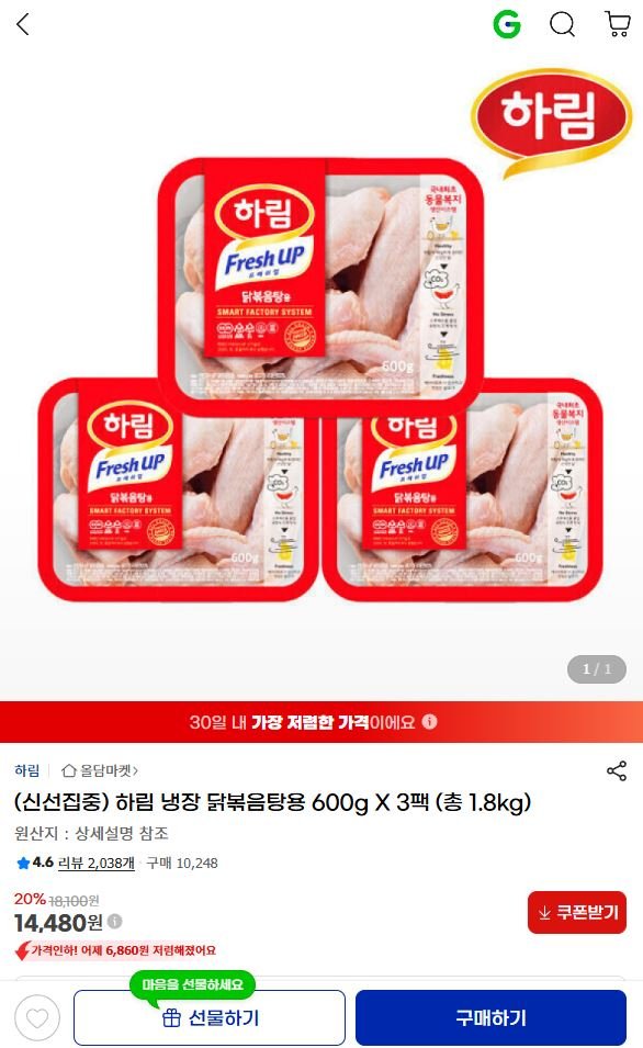 [지마켓]하림 냉장 닭볶음탕용 600g x 3팩 총1.8kg (14,480원/무료)