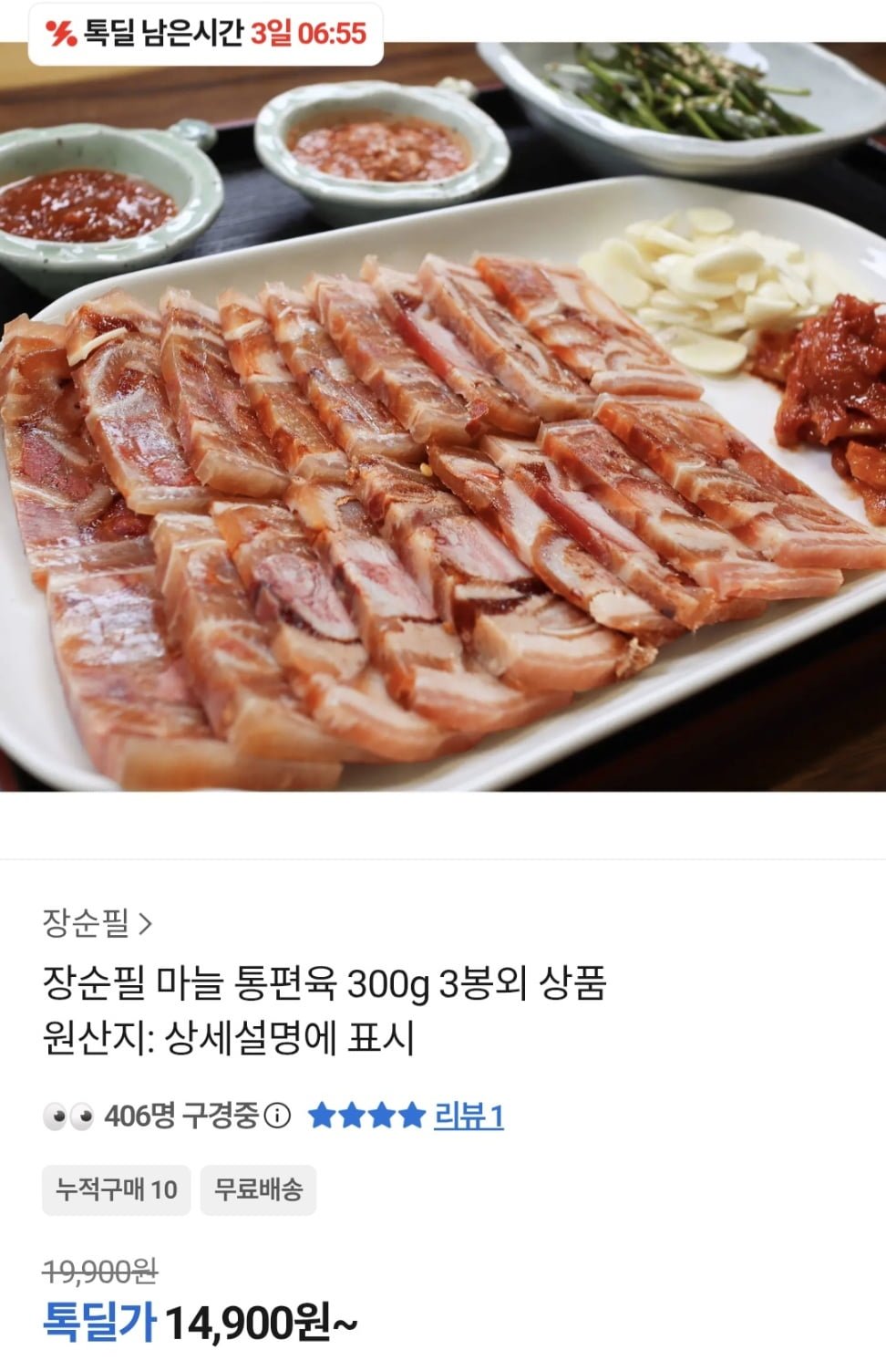 [톡딜]장순필 마늘 통편육 300g 3봉 (14,900원/무료) - 딜모아