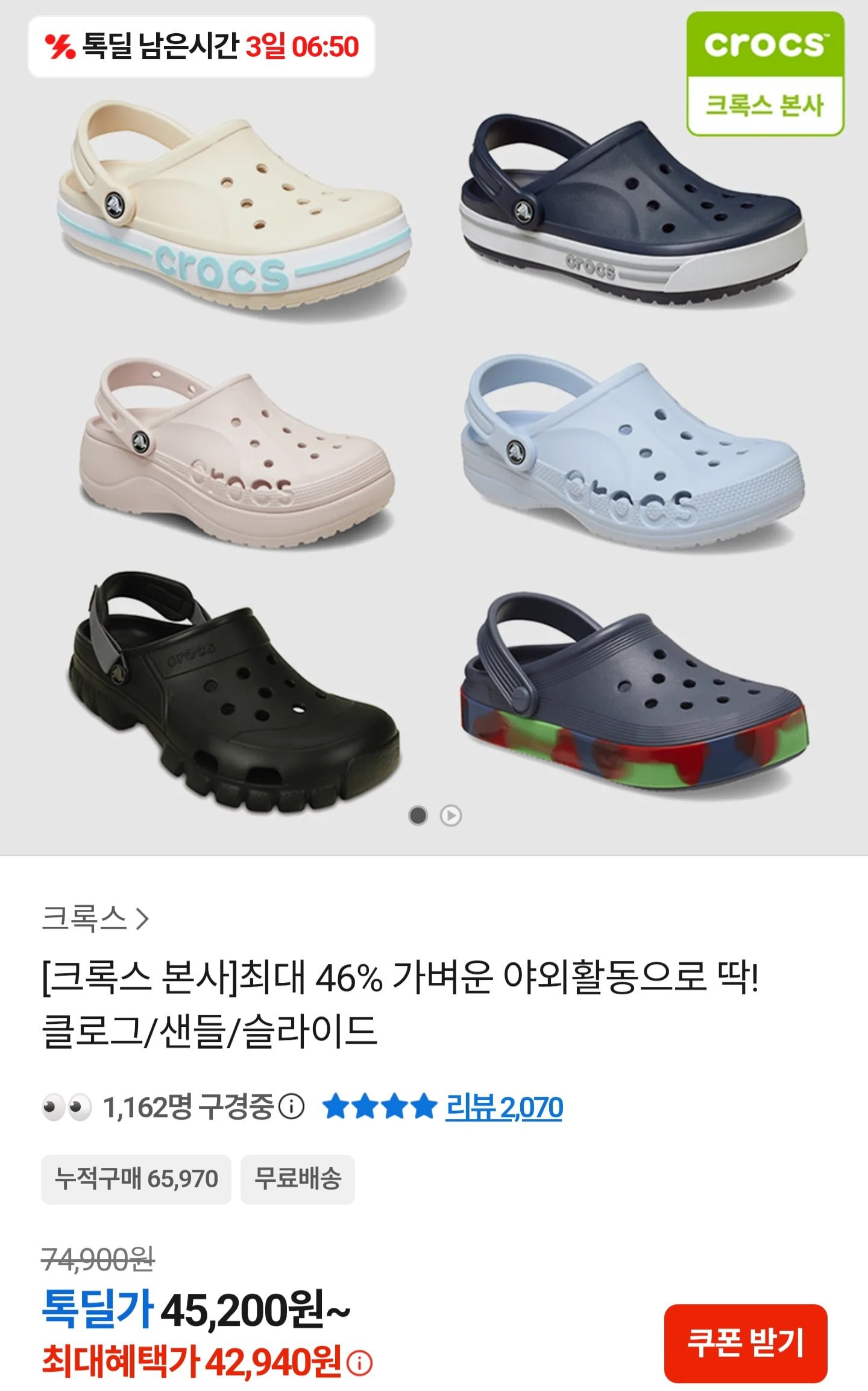 [카카오]크록스 클로그/샌들/슬라이드 등 다양 (다양/무료)
