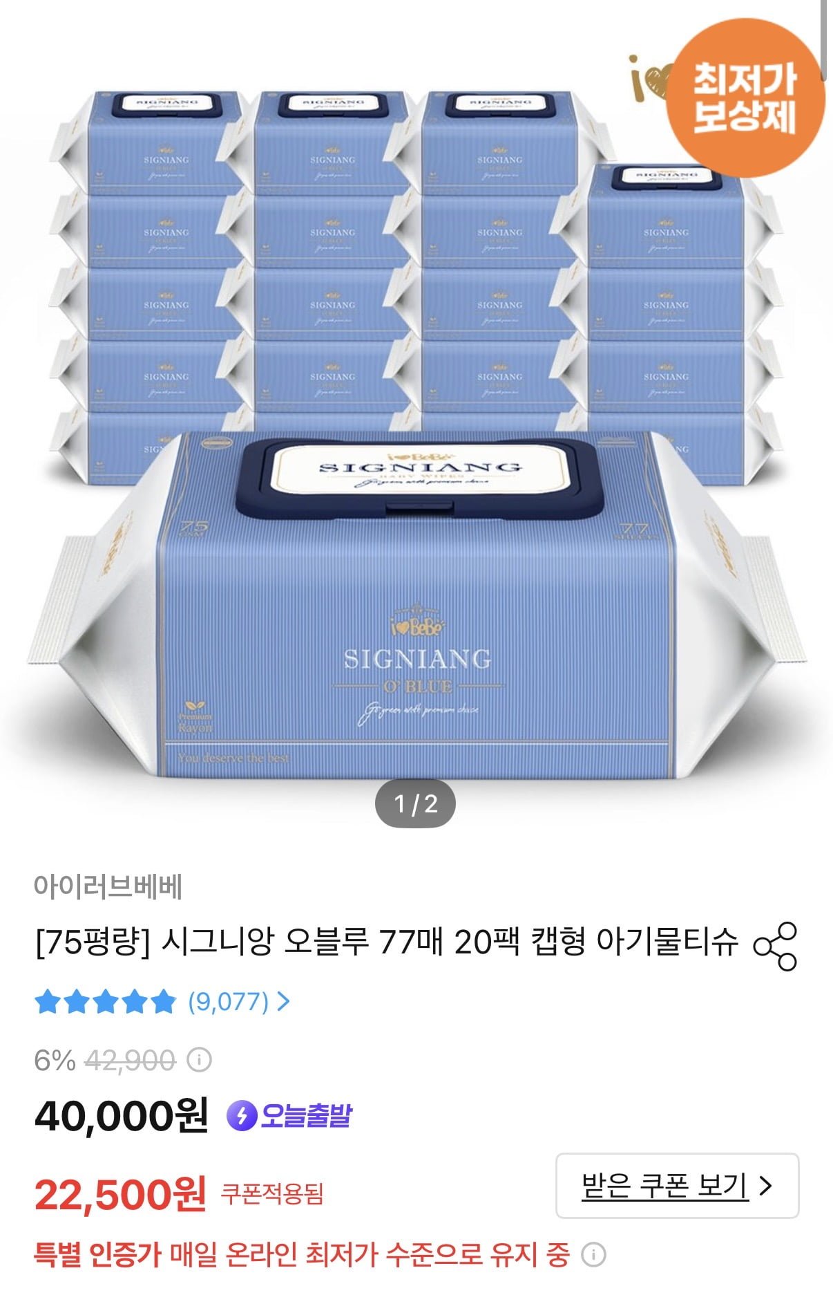 [오늘의집]아이러브베베 시그니앙 오블루 75gms 물티슈 77매 20팩 (18,925원/무료)
