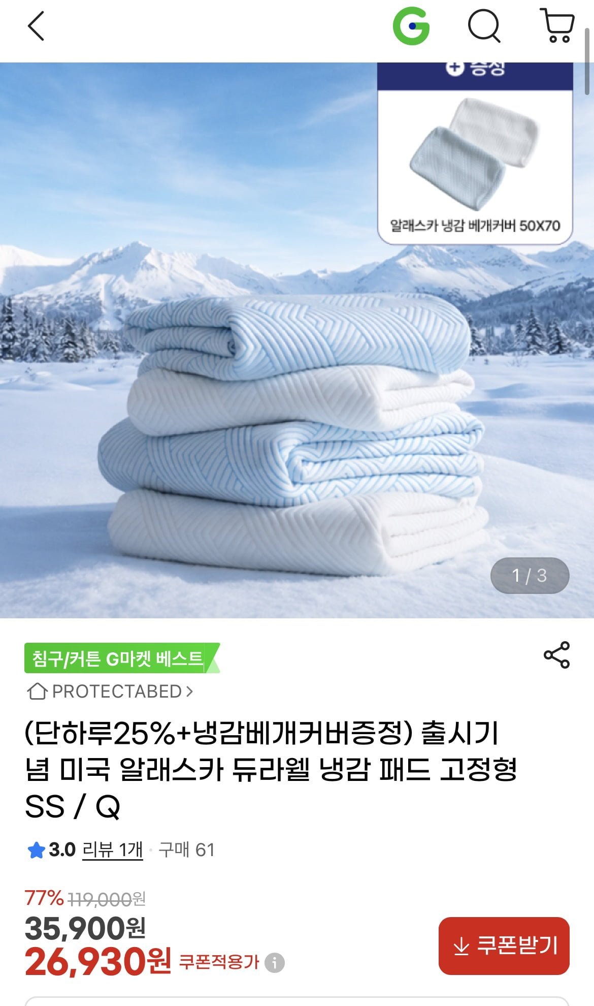 [지마켓]듀라웰 냉감 패드 고정형 SS/Q+냉감베개커버(26,930원/무료)