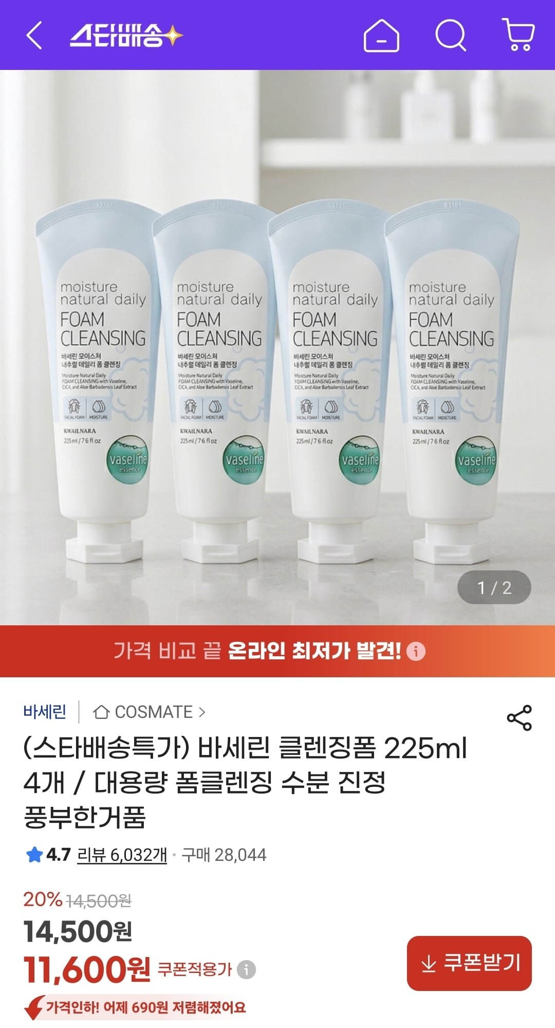 [G마켓]바세린 클렌징폼 225ml 4개 (11,600원/무료) - 딜모아