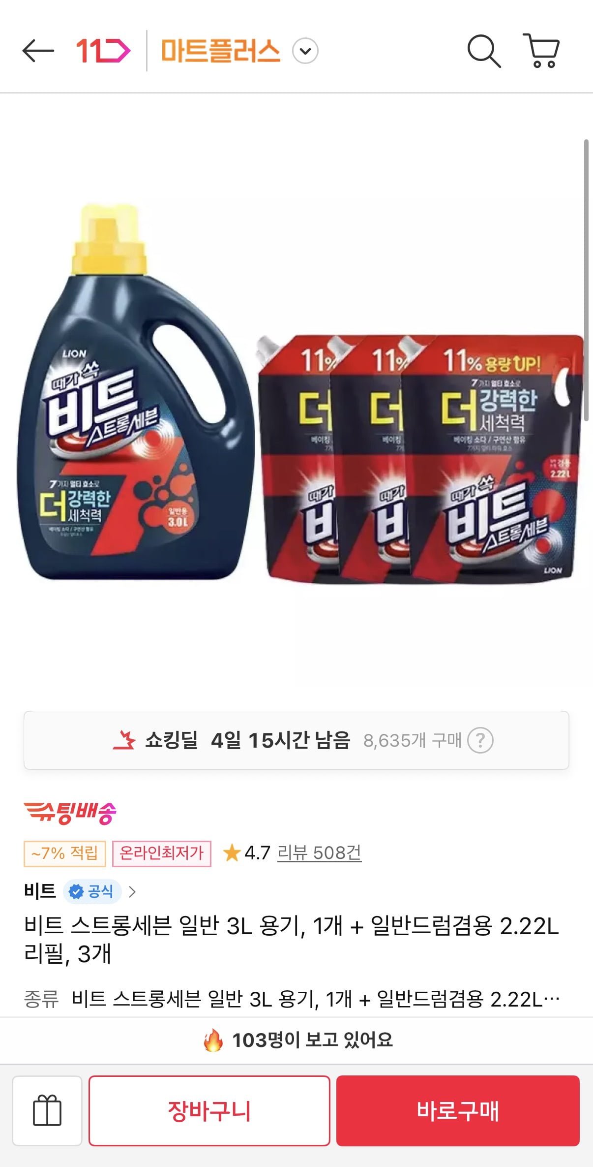 [11번가]비트 스트롱세븐 일반 3L 용기, 1개 + 일반드럼겸용 2.22L 리필, 3개 (티멤15,940원/무료)뽐뿌·-403분 전·15,940원👍 0💬 0기타11번가원문 보기 →