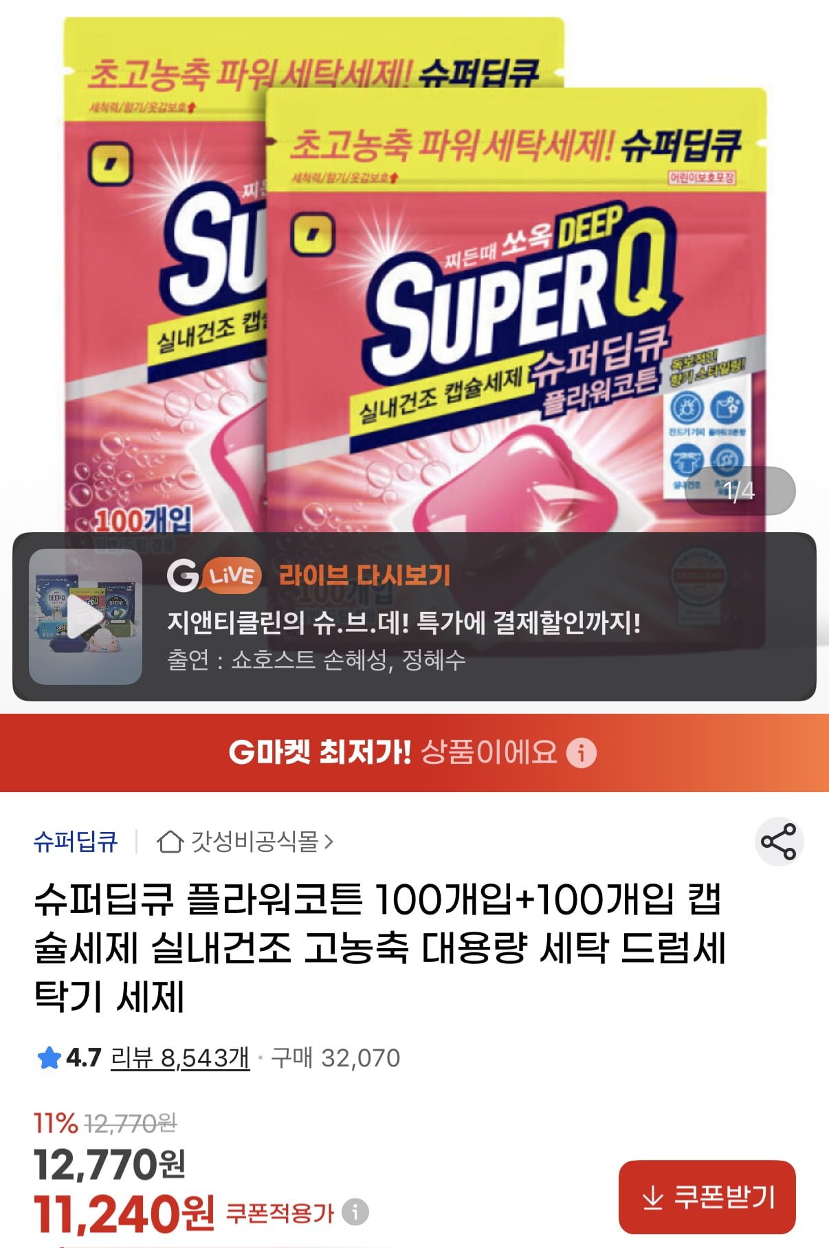 [지마켓]슈퍼딥큐 캡슐세제 플라워코튼 100개+100개 (11,240원/무료)