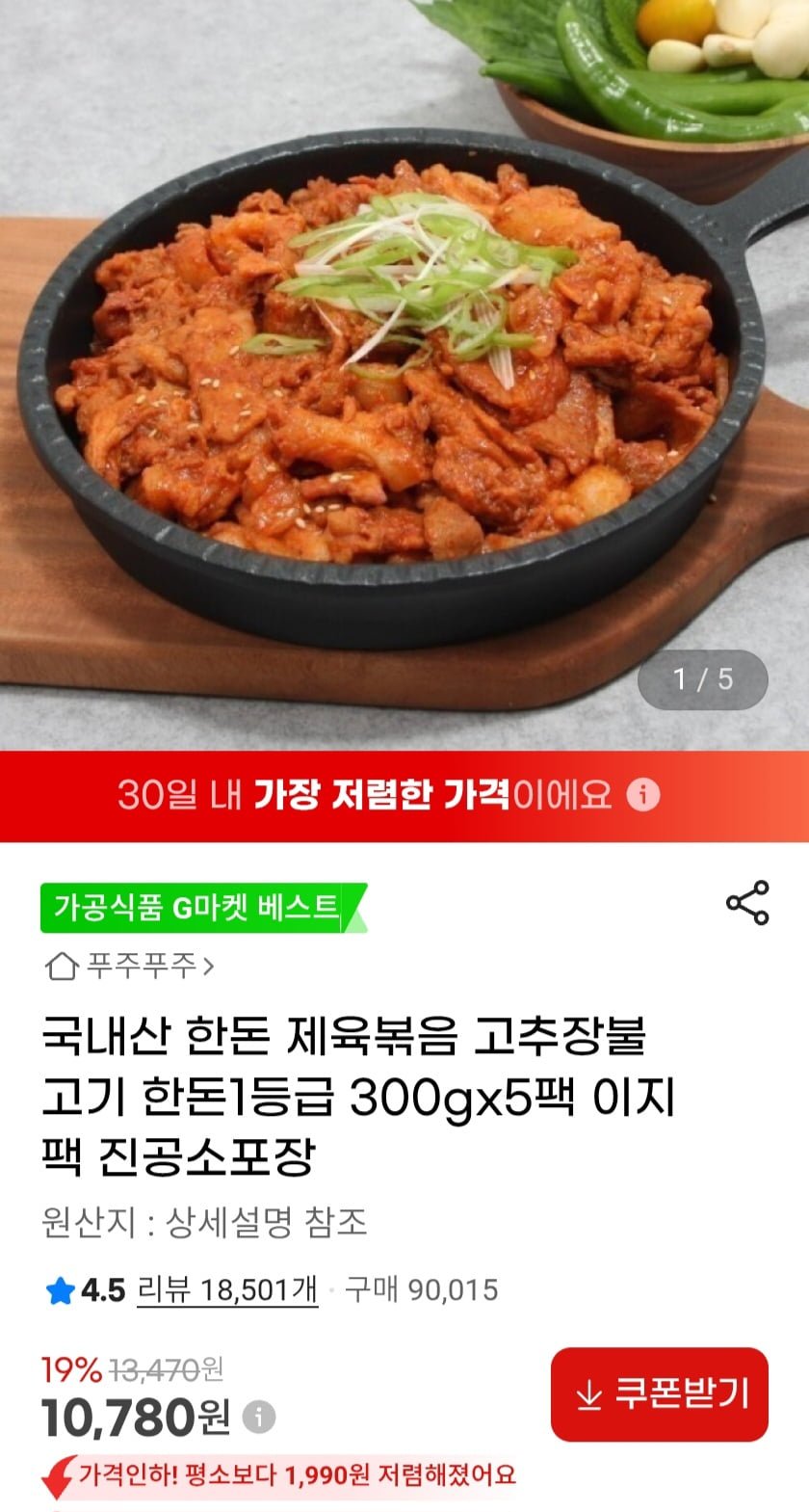 [지마켓]국내산 제육볶음 고추장불고기 300g x 5팩 (10,780원/무료)