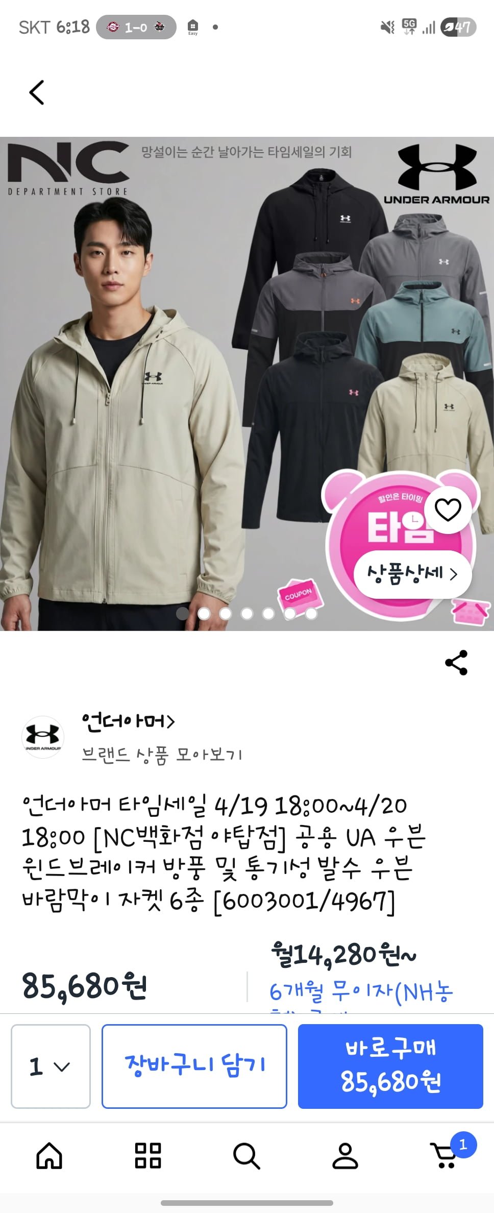 [쿠팡]언더아머 윈드브레이커 바람막이자켓 [85,680원/무배]