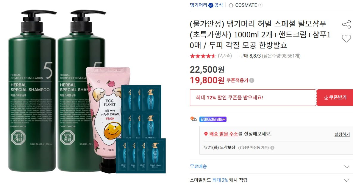 [옥션]댕기머리 허벌 스페셜 샴푸 1000ml 2개+핸드크림+샘플 10매(19,800/무배)