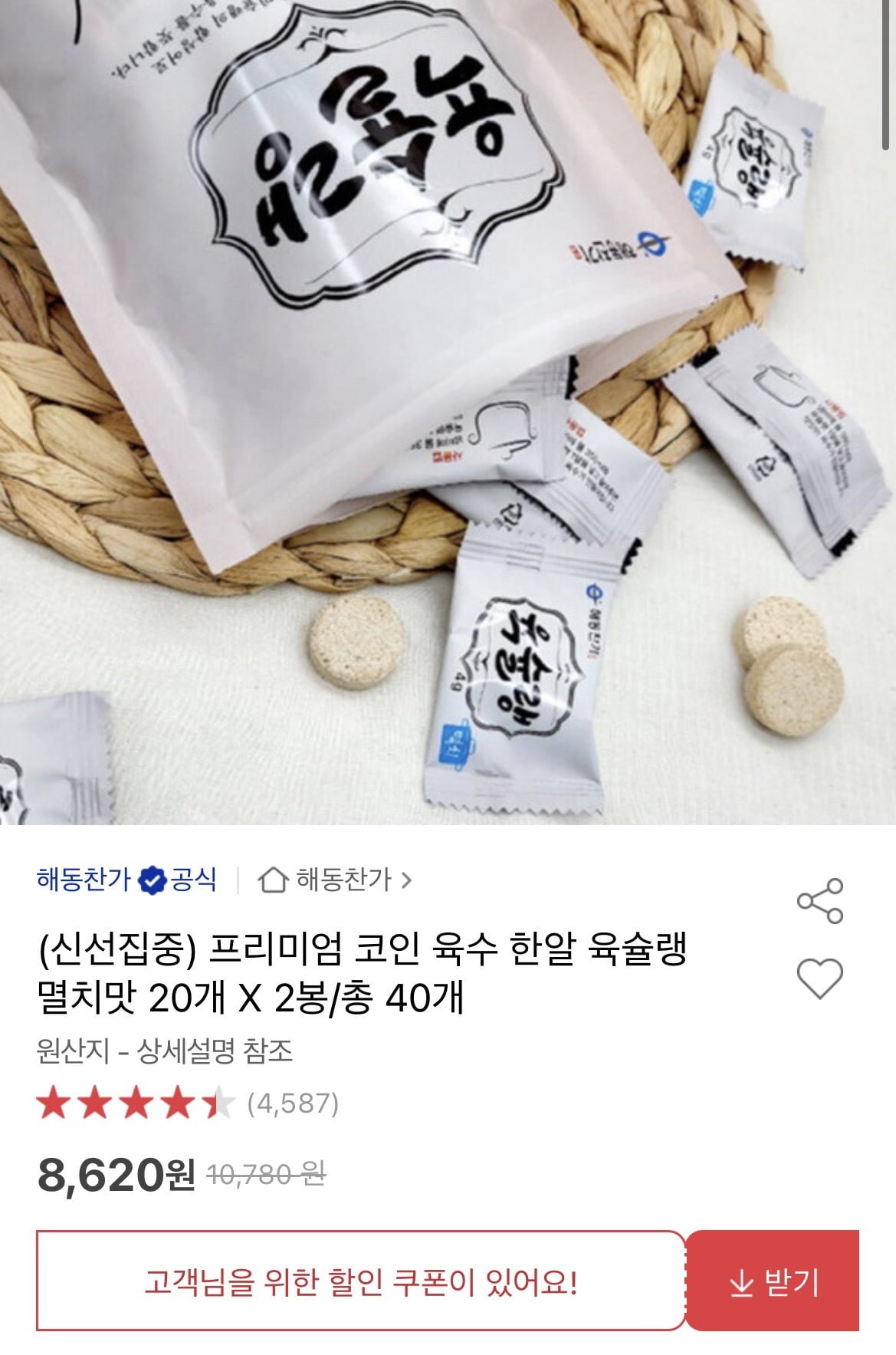[옥션]프리미엄 코인 육수 멸치맛 20개 2봉 (8620원/무배)