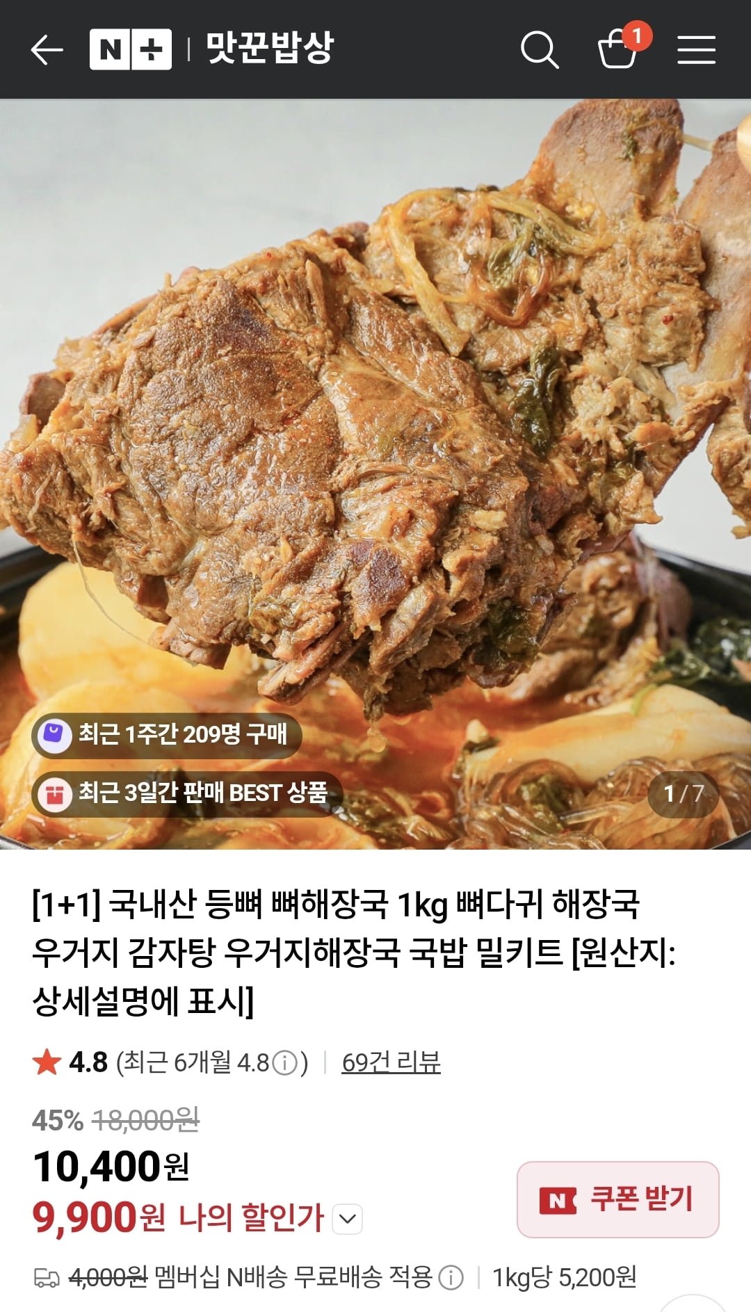 [네이버]국내산 우거지 뼈해장국 1kg x 2팩 (9,900원/네멤무배) - 딜모아