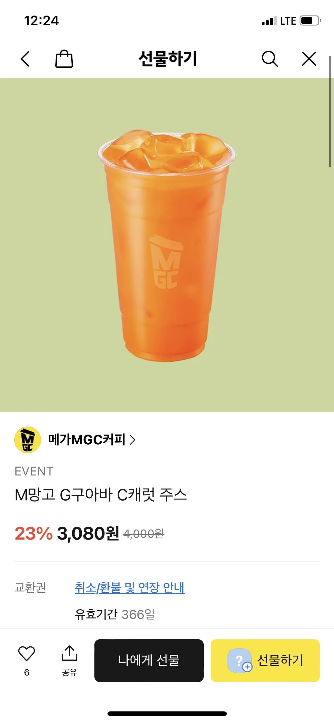 [카톡선물하기]메가MGC커피 M망고 G구아바 C캐럿 주스 (3080원/무배)