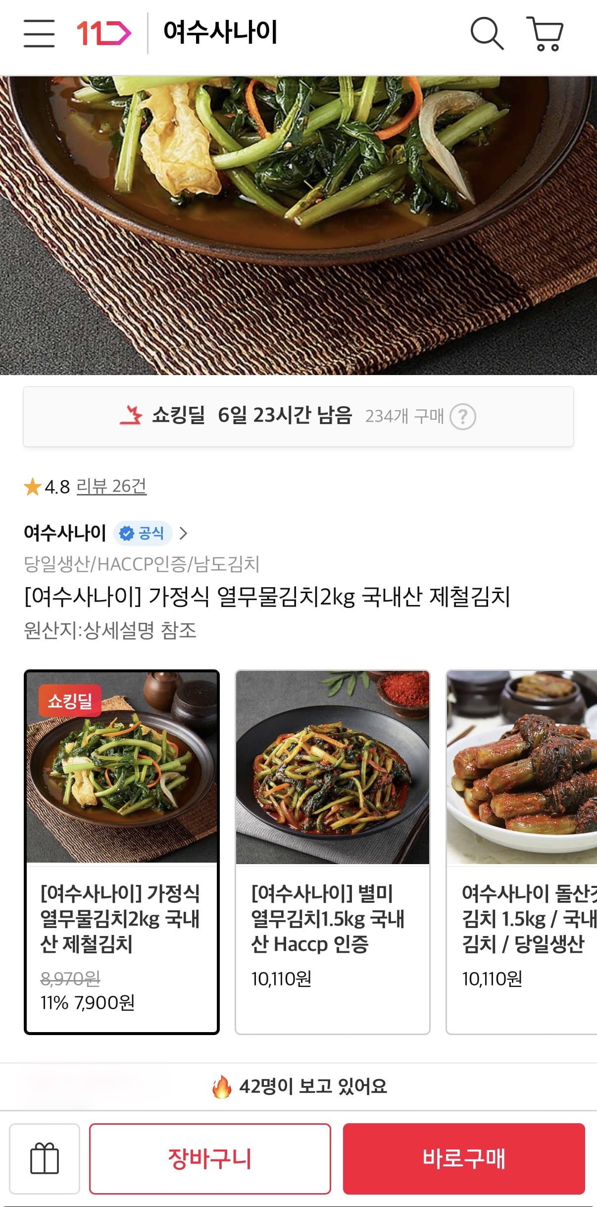 [11번가]열무물김치2kg 국내산 (7,900원/무료)