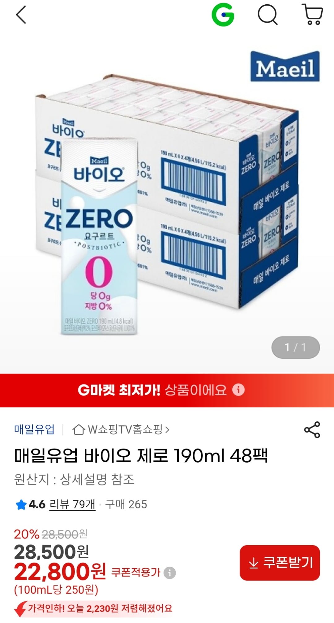 [G마켓]매일유업 바이오 제로 190ml 48팩 (22,800원 / 무료)