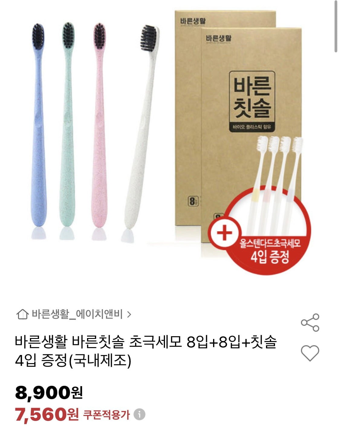 [옥션]바른생활 바른칫솔 초극세모 8입+8입 (유클7,560원/무료)