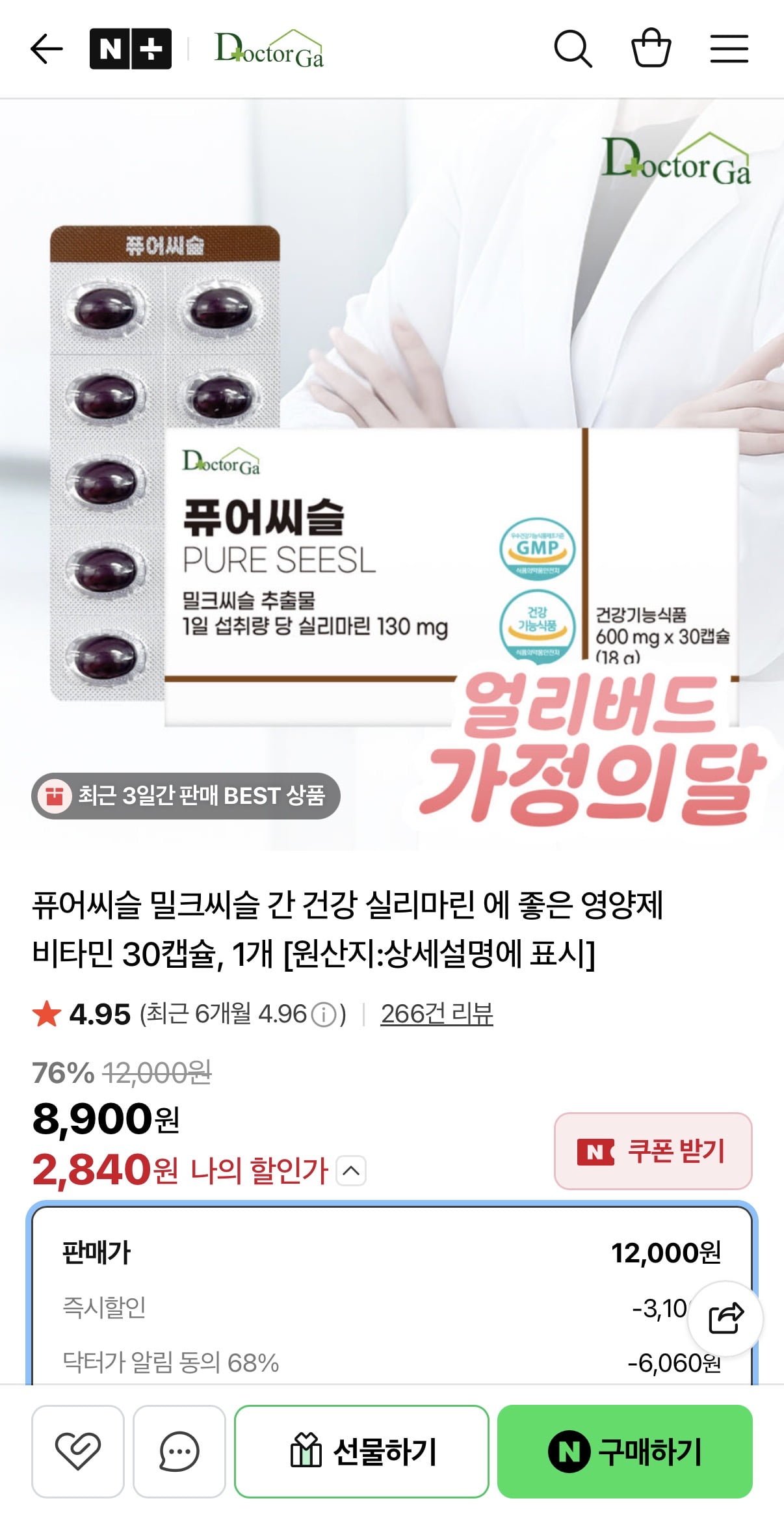 [네이버]퓨어씨슬 밀크씨슬 간 건강 실리마린 30캡슐 (2,840원/네멤무료)