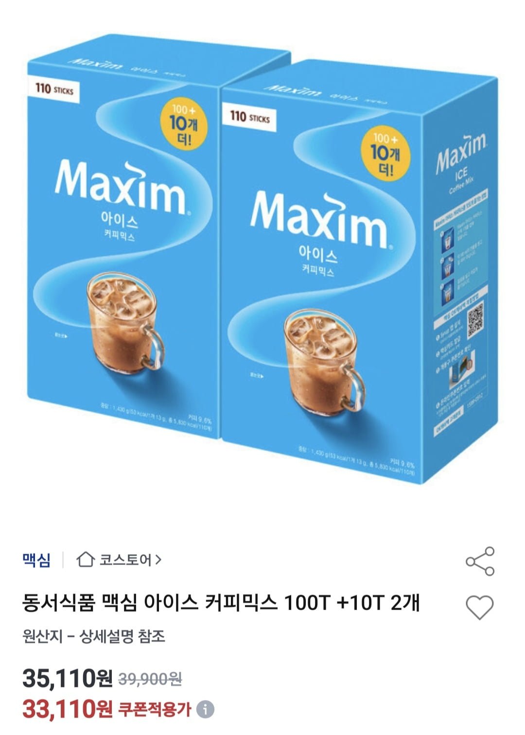 [옥션]맥심 아이스 커피믹스 100T + 10T 2개 (33,110원/무료)