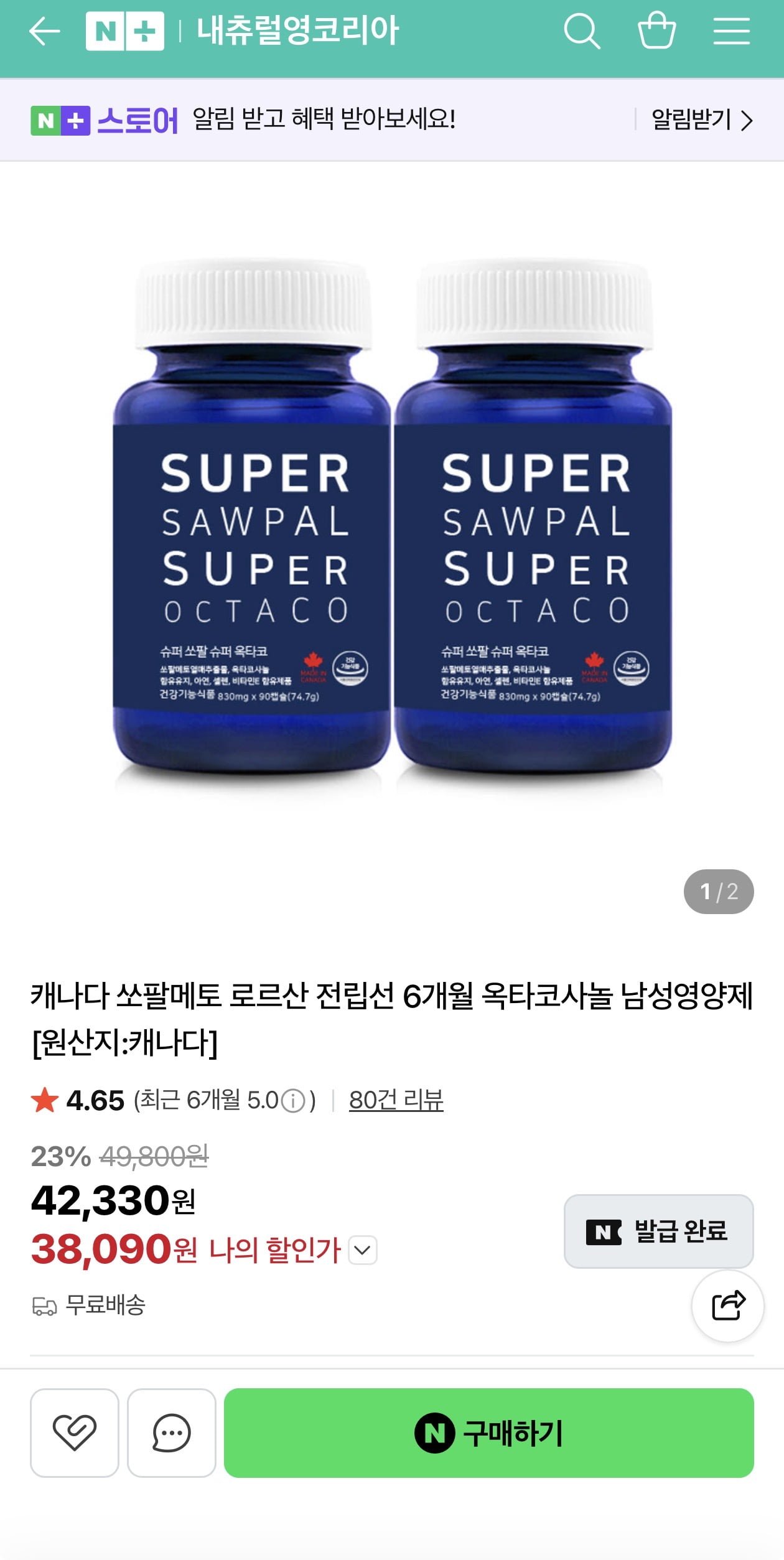 [네이버]쏘팔메토 로르산 전립선 6개월분 옥타코사놀(38,090원/무료)