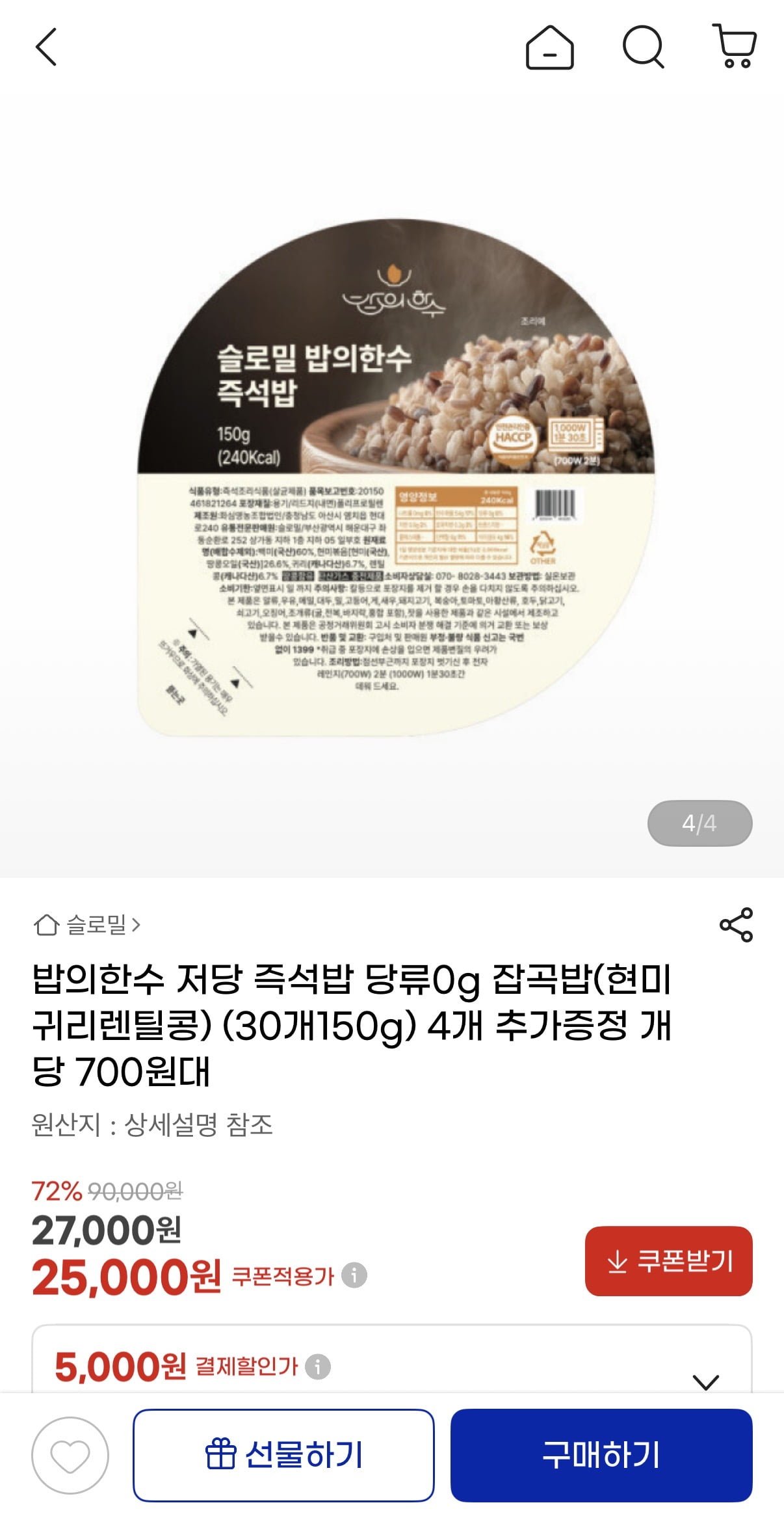 [지마켓]밥의한수 저당 즉석밥 당류0g 잡곡밥 30개 + 4개 증정 (25,000원/무배)
