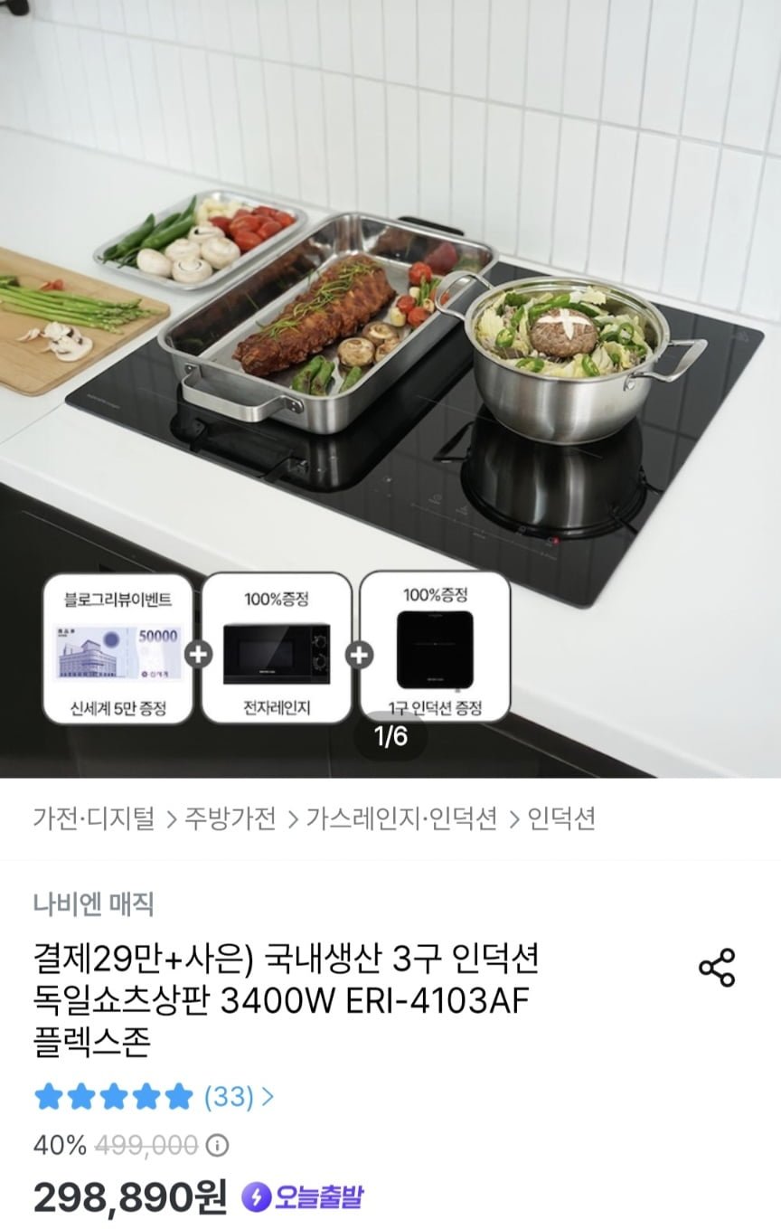 [오늘의집]국내생산 3구 인덕션 독일쇼츠상판 3400W ERI-4103AF 플렉스존 (298,890원/무료)