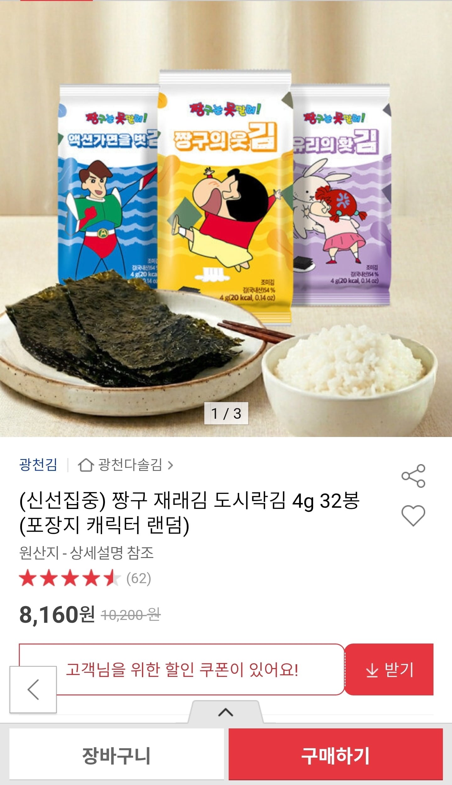 [옥션]짱구 재래김 도시락김 4g 32봉 (8,160원/무료)