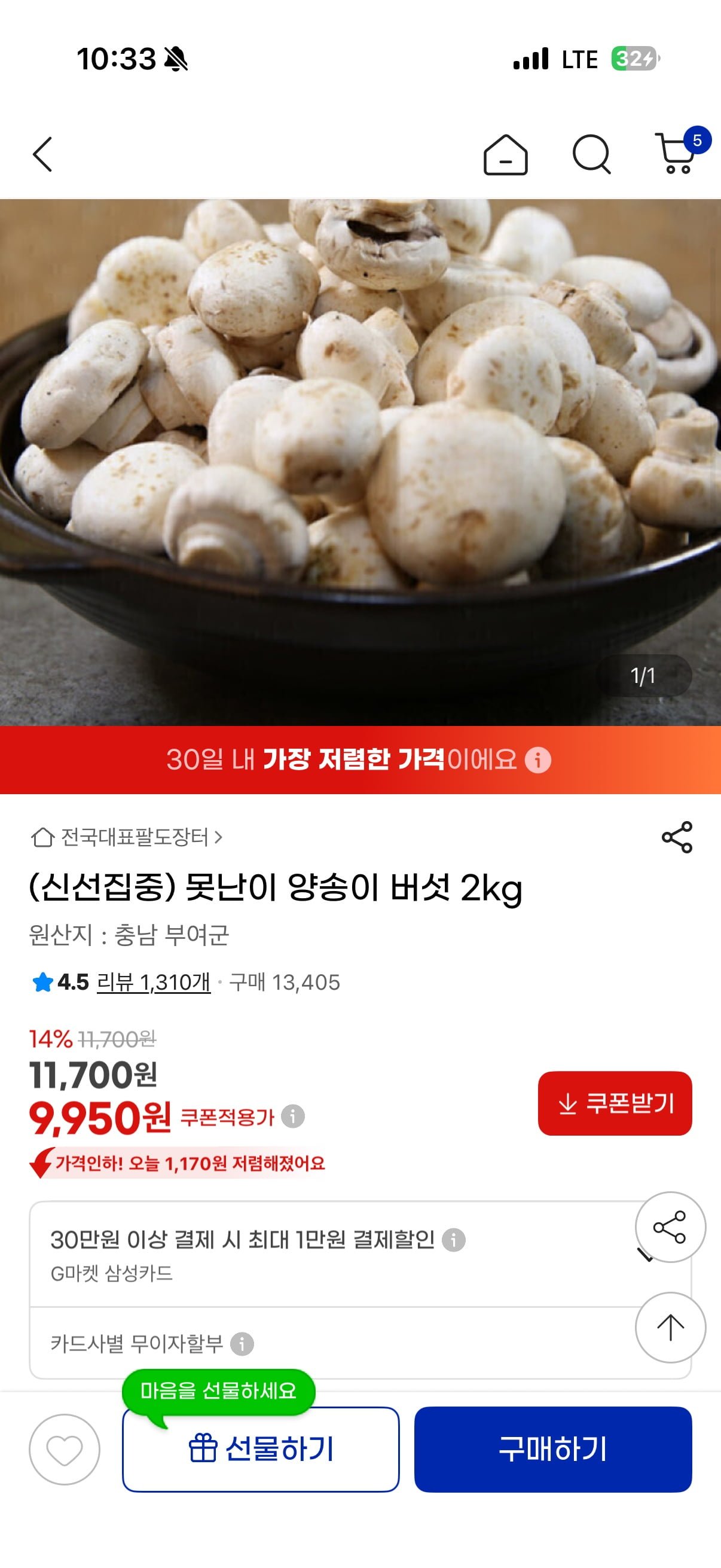 [지마켓]못난이양송이2kg(9950원/무료배송)