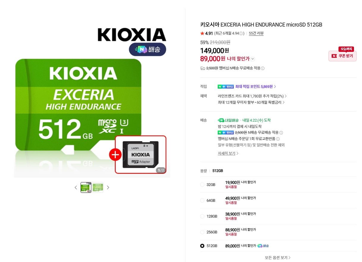 [네이버]키오시아 EXCERIA HIGH ENDURANCE microSD 512GB (149,000원/무배)