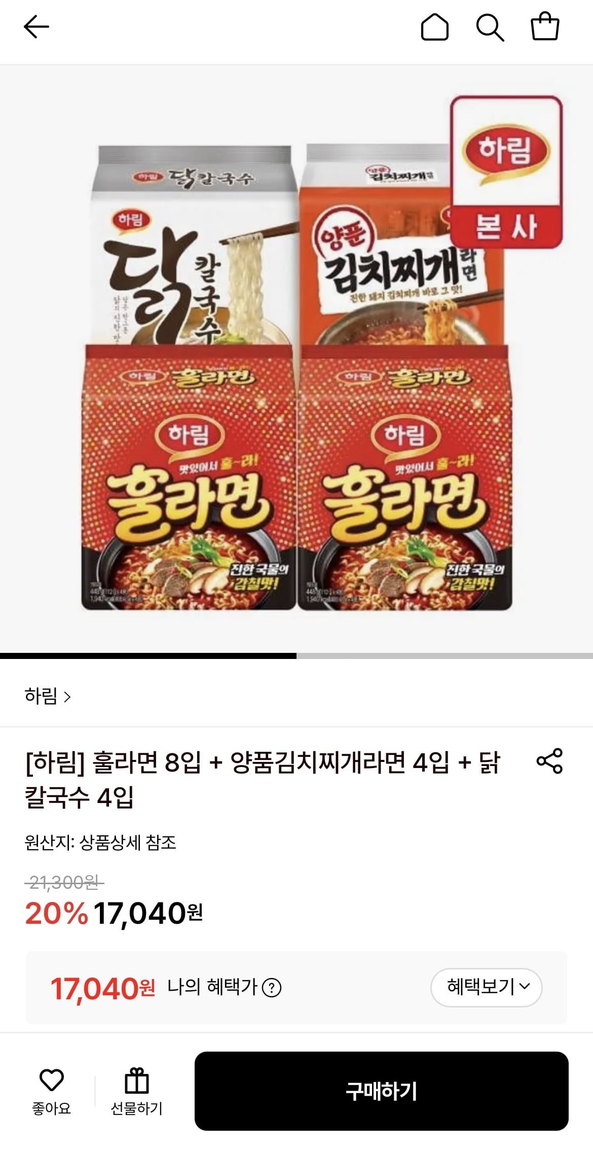 [롯데온]하림 라면 양푼김치찌개 8개+훌라면 4개+닭칼국수 4개 (17,040원/무료)