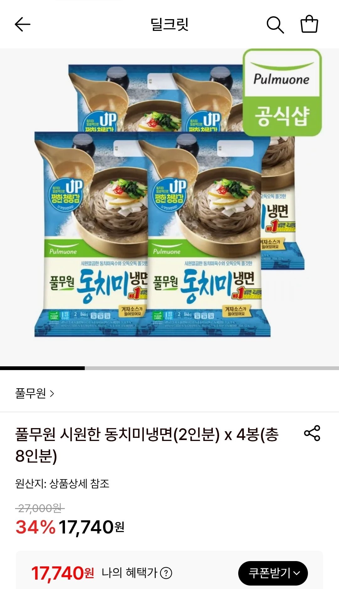 [롯데온]풀무원 시원한 동치미냉면 2인분 x 4봉 (17,740원/무료) - 딜모아