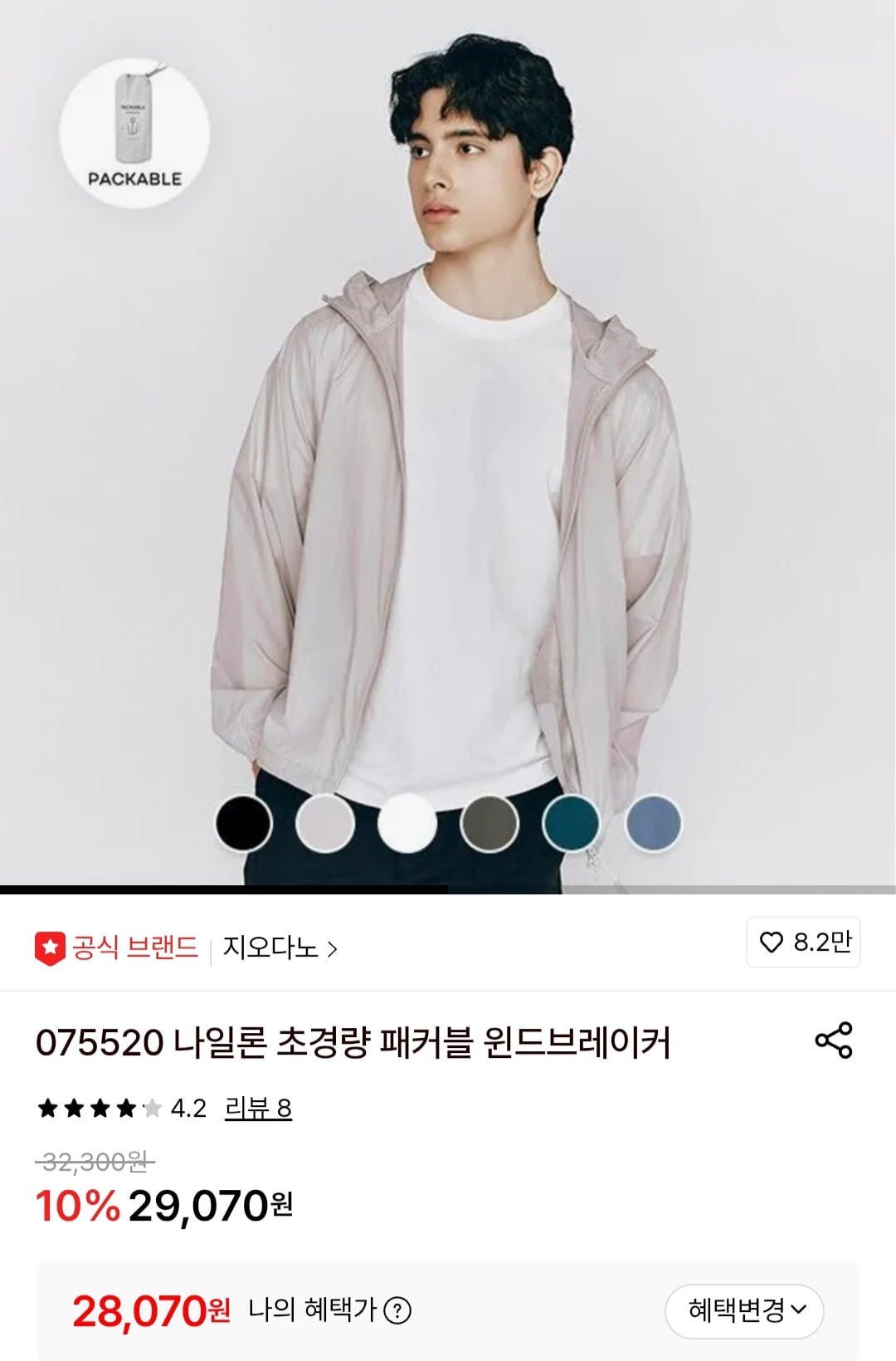 [롯데온]지오다노 나일론 초경량 패커블 윈드브레이커 (28,070원/무료)