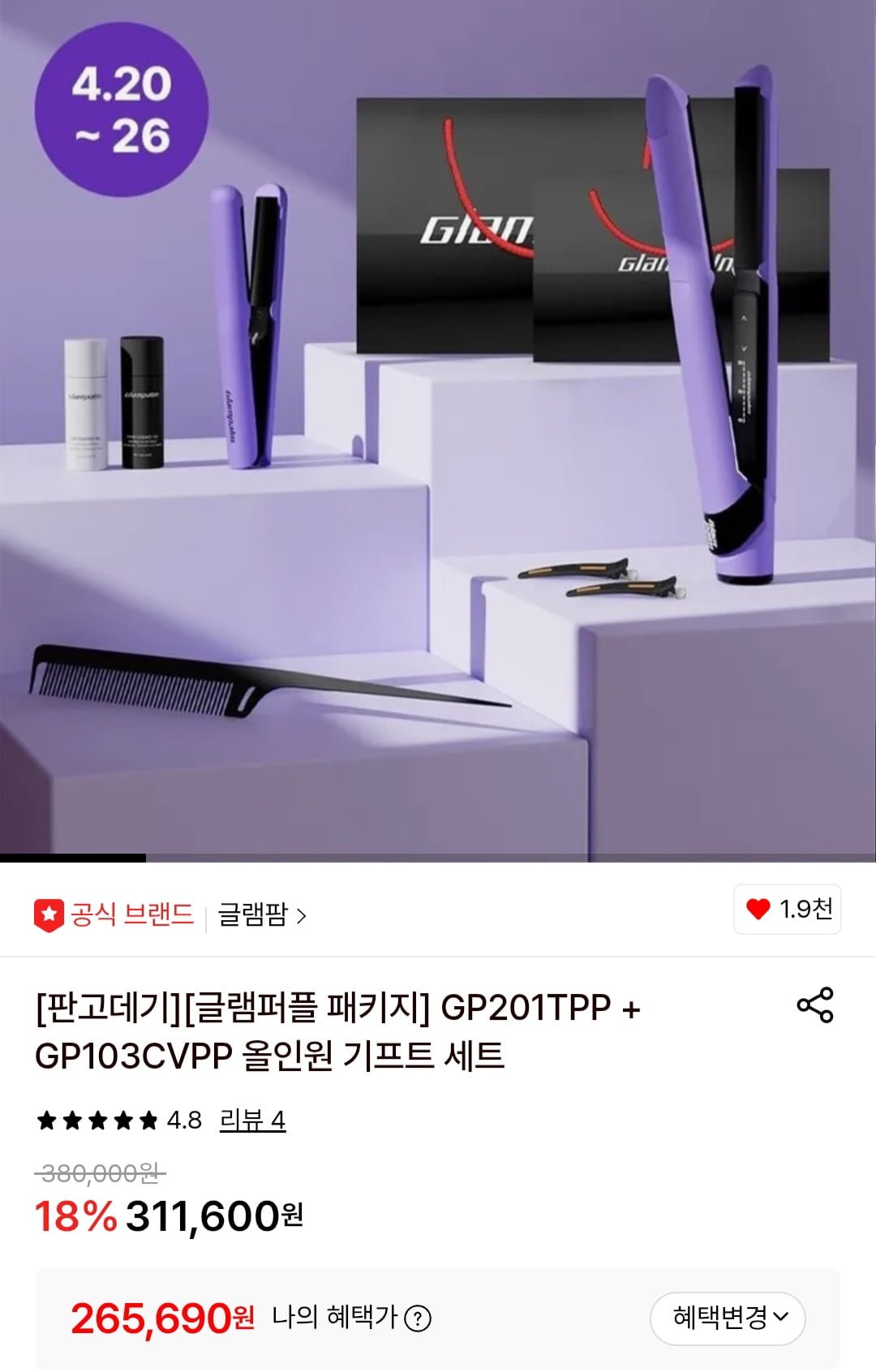 [롯데온]글램팜 퍼플 고데기 세트 (롯데 국민카드 265,690원/무료)