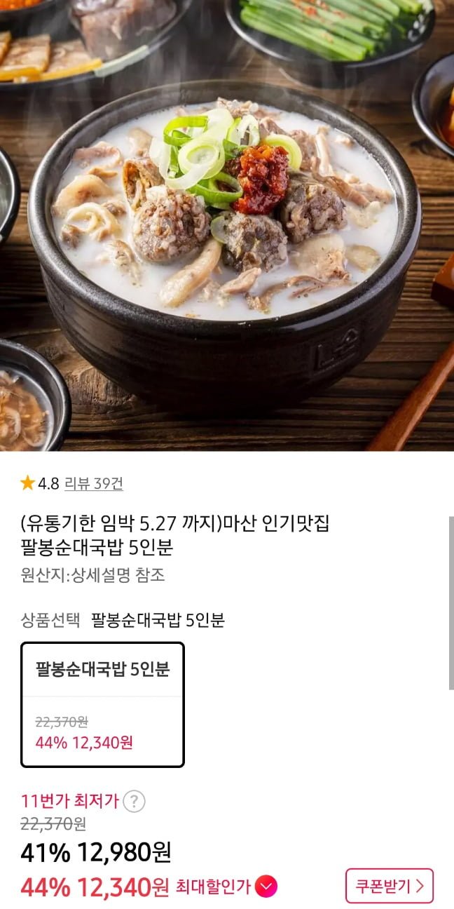 [11번가]팔봉 순대국밥 5인분 임박 (12,980원/무료)