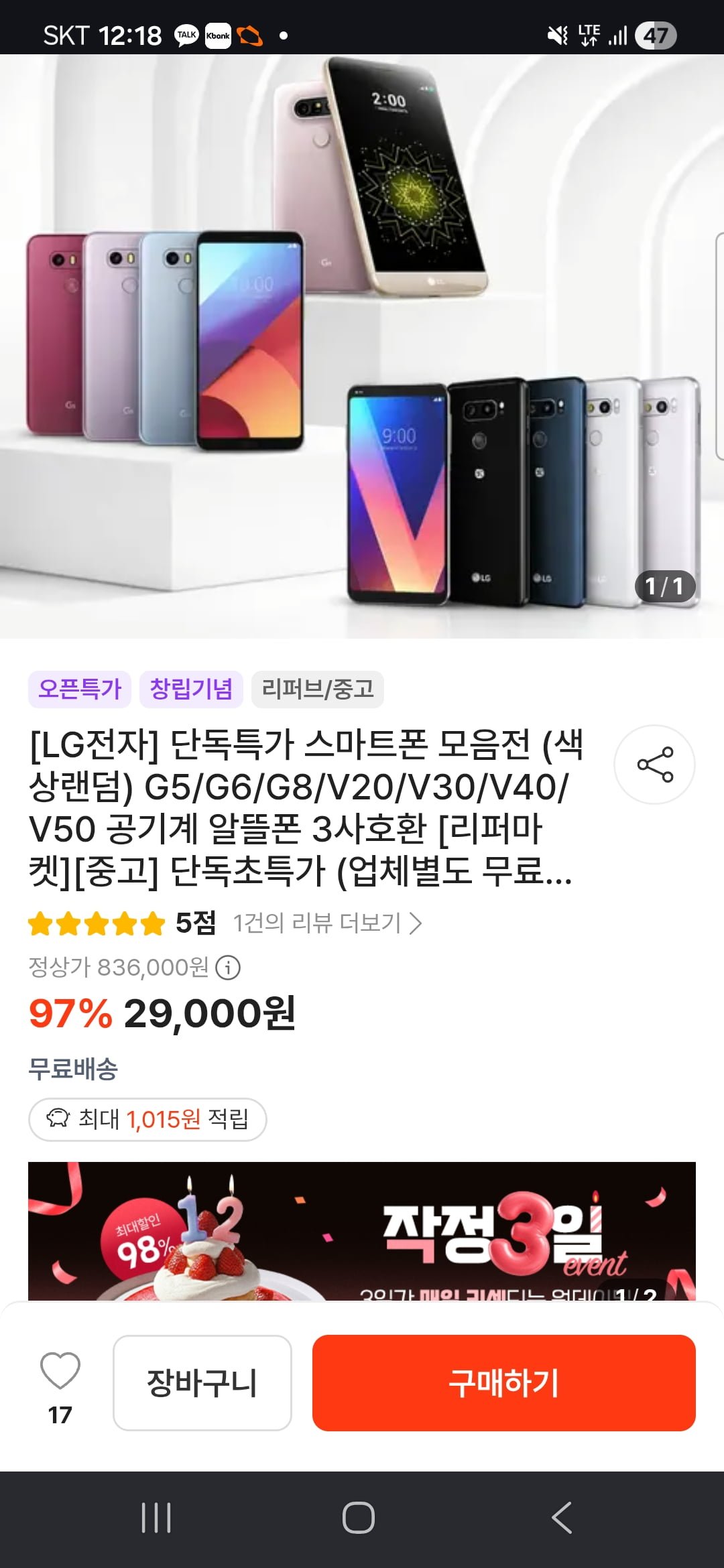 [떠리몰]LG전자 단독특가 스마트폰 모음전 G5/G6/G8/V20/V30/V40/V50 (29,000원부터/무료)