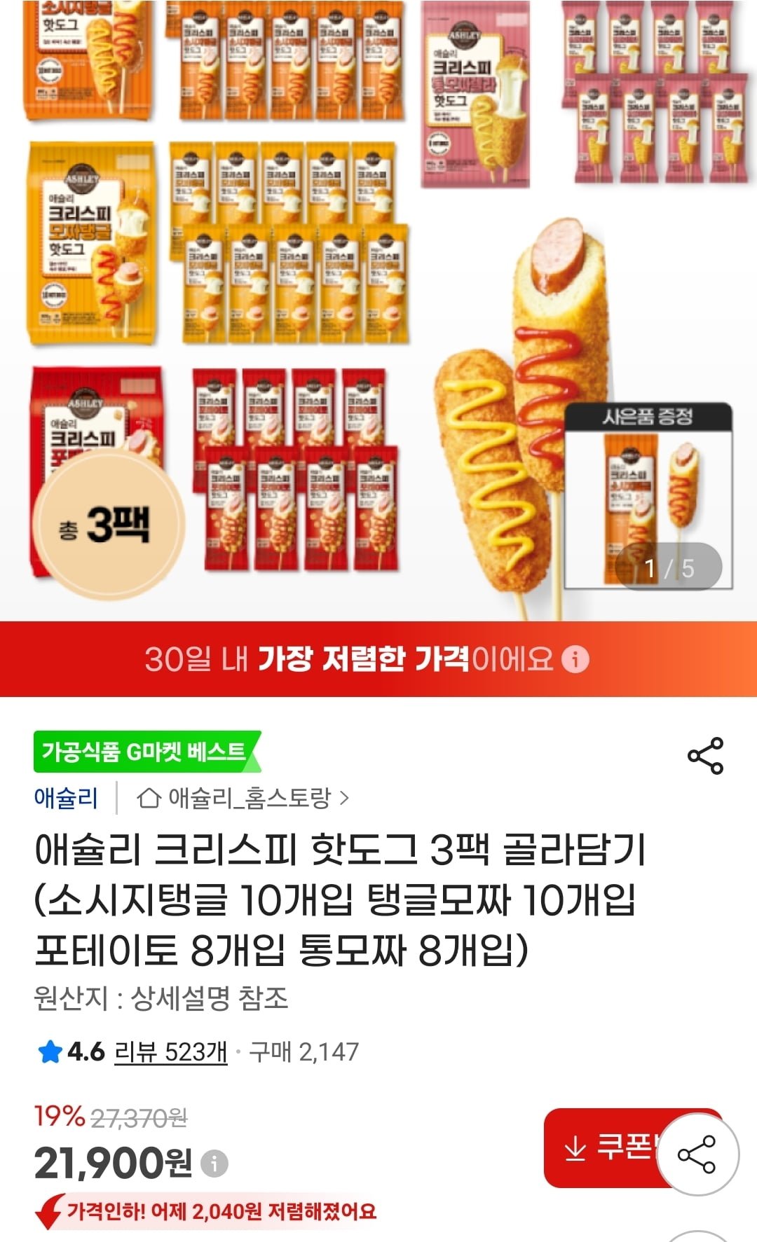 [지마켓]애슐리 크리스피 핫도그 4종 3팩 골라담기 (21,900원/무료) - 딜모아