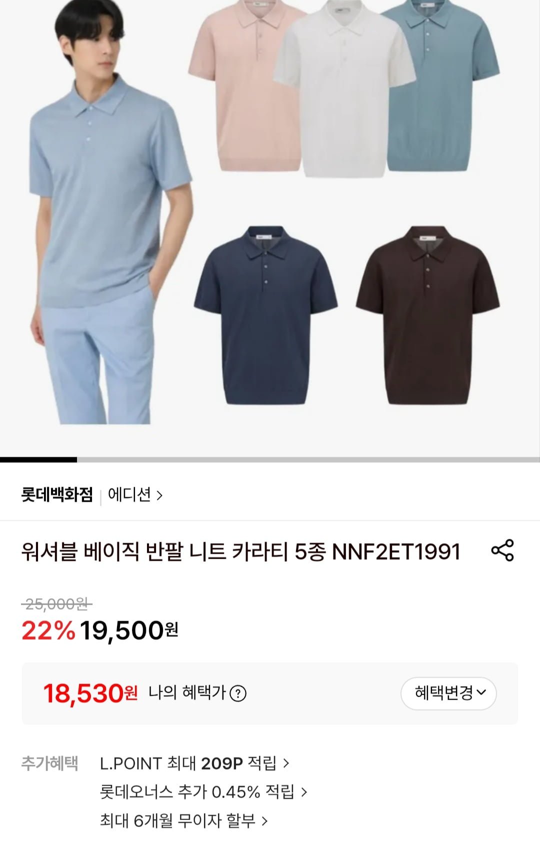 [롯데온]워셔블 베이직 반팔 니트 카라티 5종 (18,530원/3,000원)