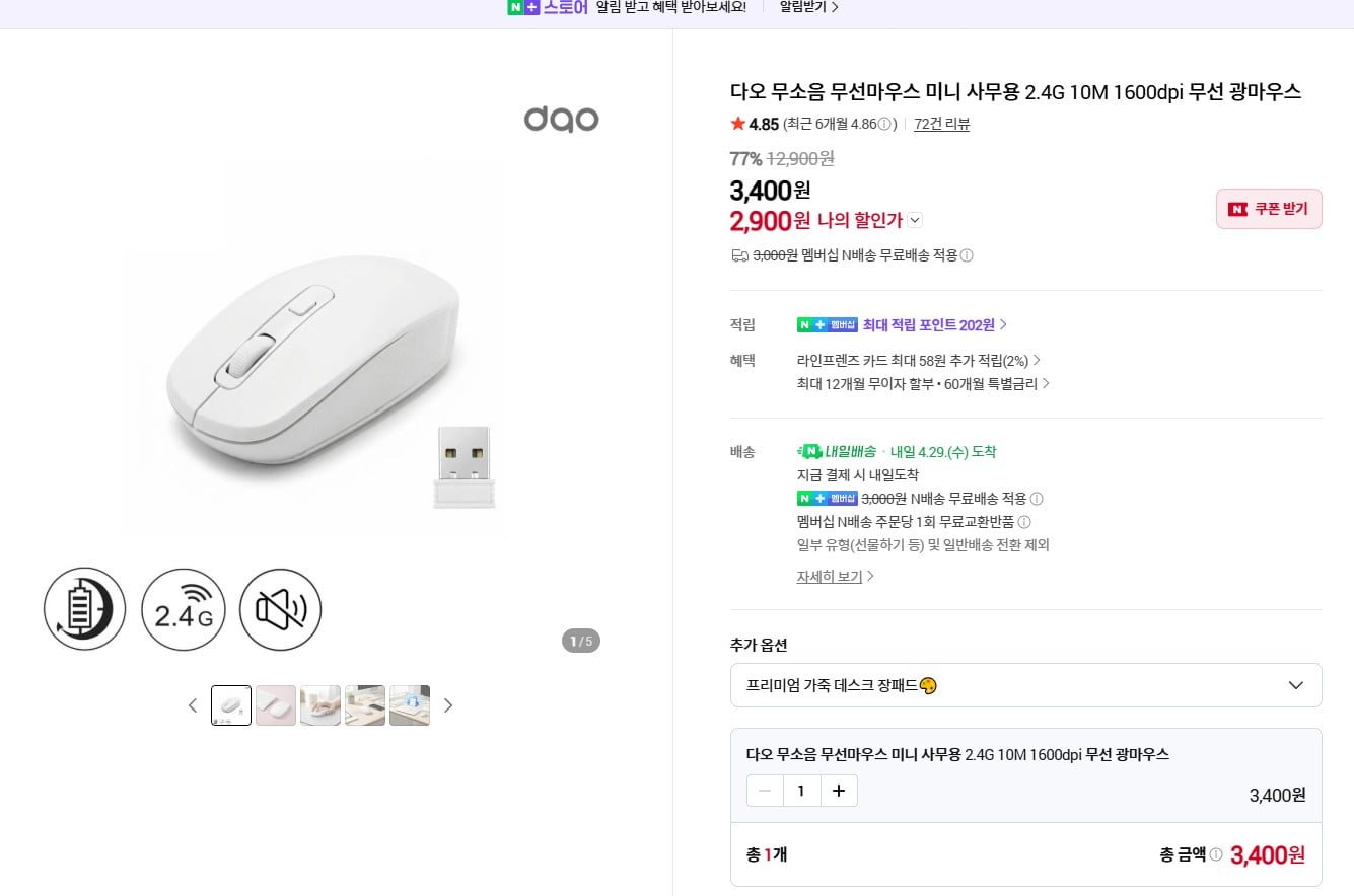 [네이버]다오 무소음 무선마우스 미니 사무용 2.4G 무선 광마우스 (2,900원/3,000원)