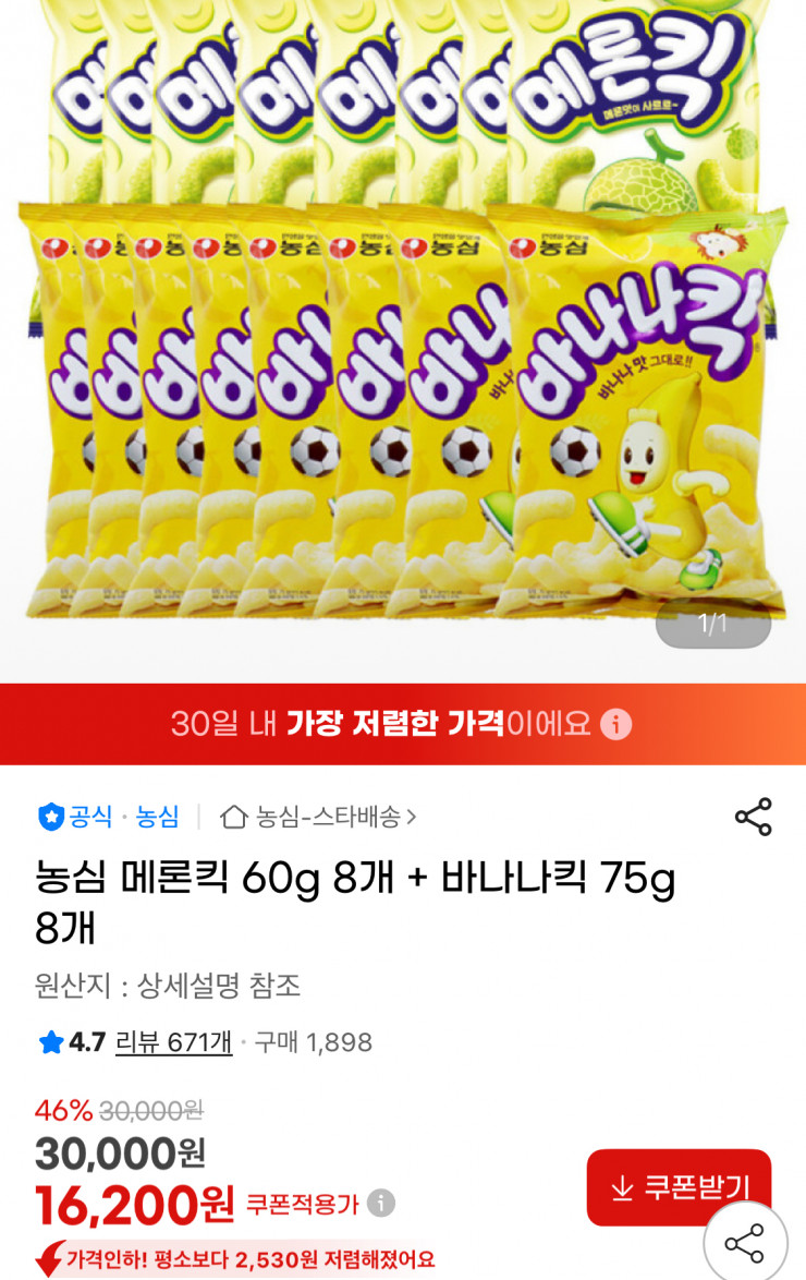 [지마켓] 농심 메론킥 60g 8개 + 바나나킥 75g 8개