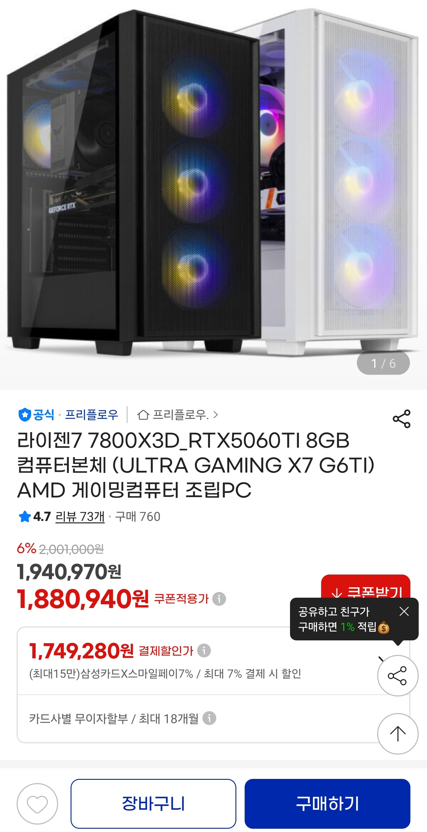 [지마켓] 프리플로우 783D+5060TI 8 G+32G+ssd 1T 완본체 (체감가 약1,687,...