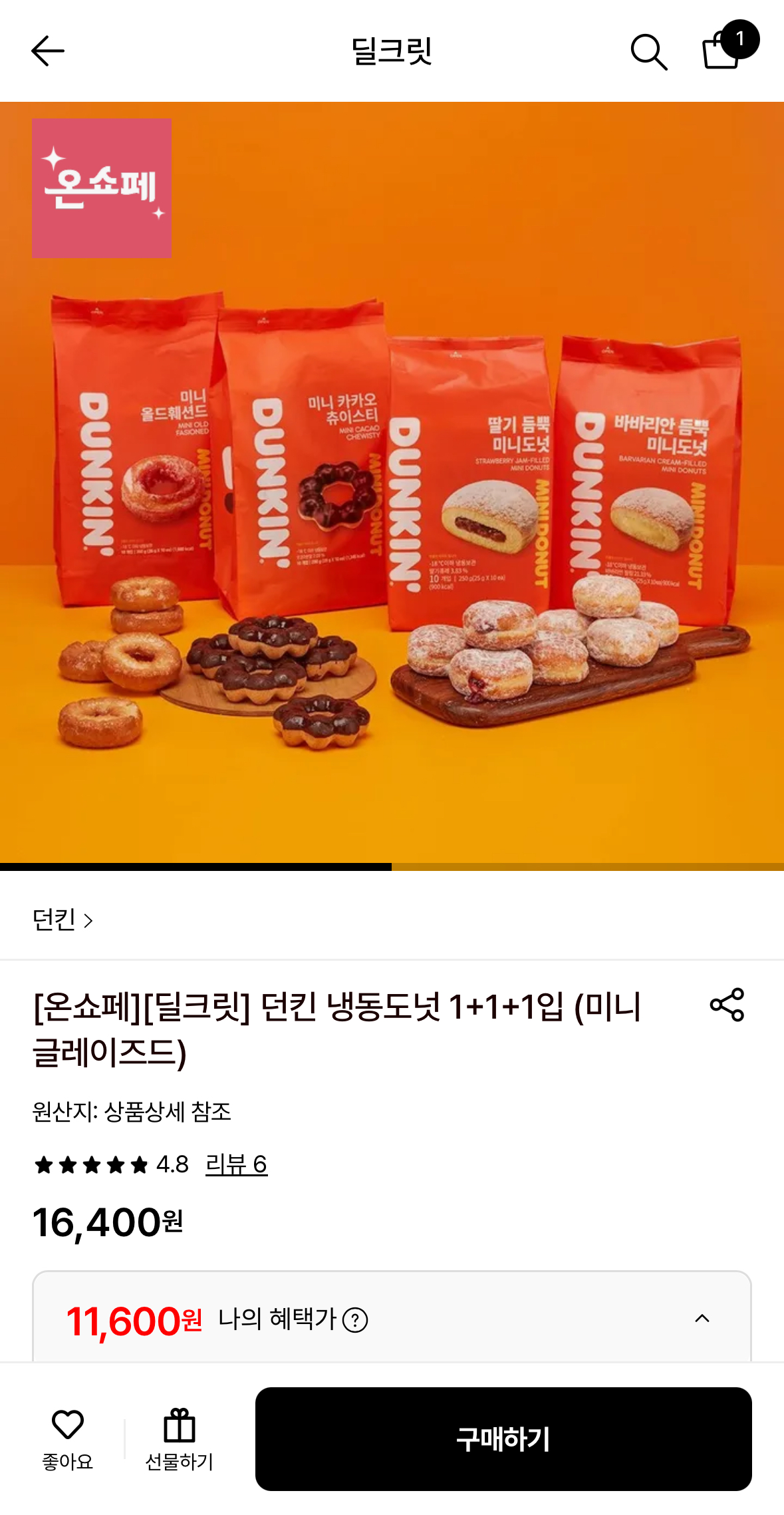 [롯데온] 던킨 냉동도넛 7종 1+1+1팩 골라담기 (11,600원/무료)