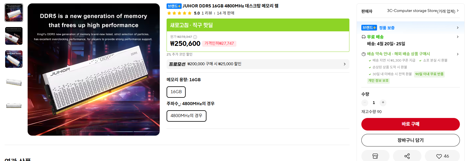[알리] 주호 DDR5 4800MHZ 16GB 화이트 (16만원 후반)