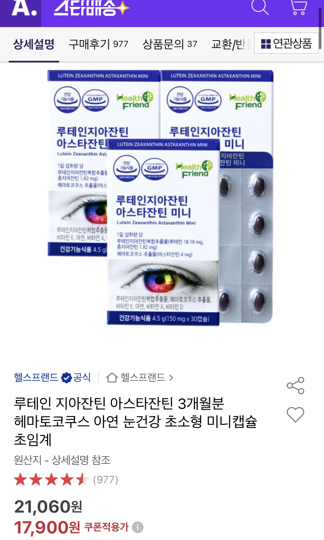 [옥션] 루테인 지아잔틴 아스타잔틴 미니캡슐 3개월분 (17,900원/무료)