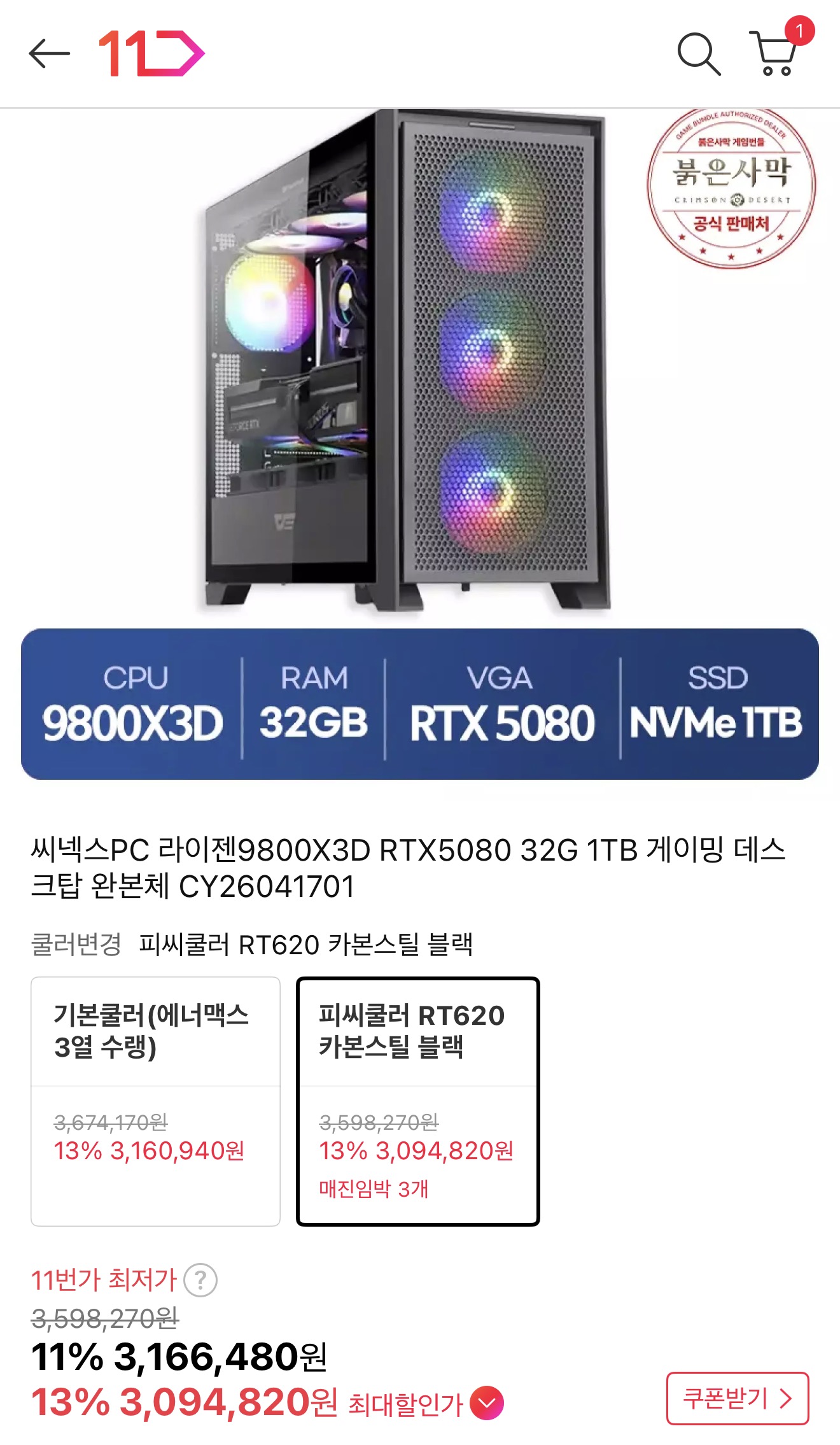 [11번가] 9800x3D + RTX 5080 + 32GB + 1TB 완본체