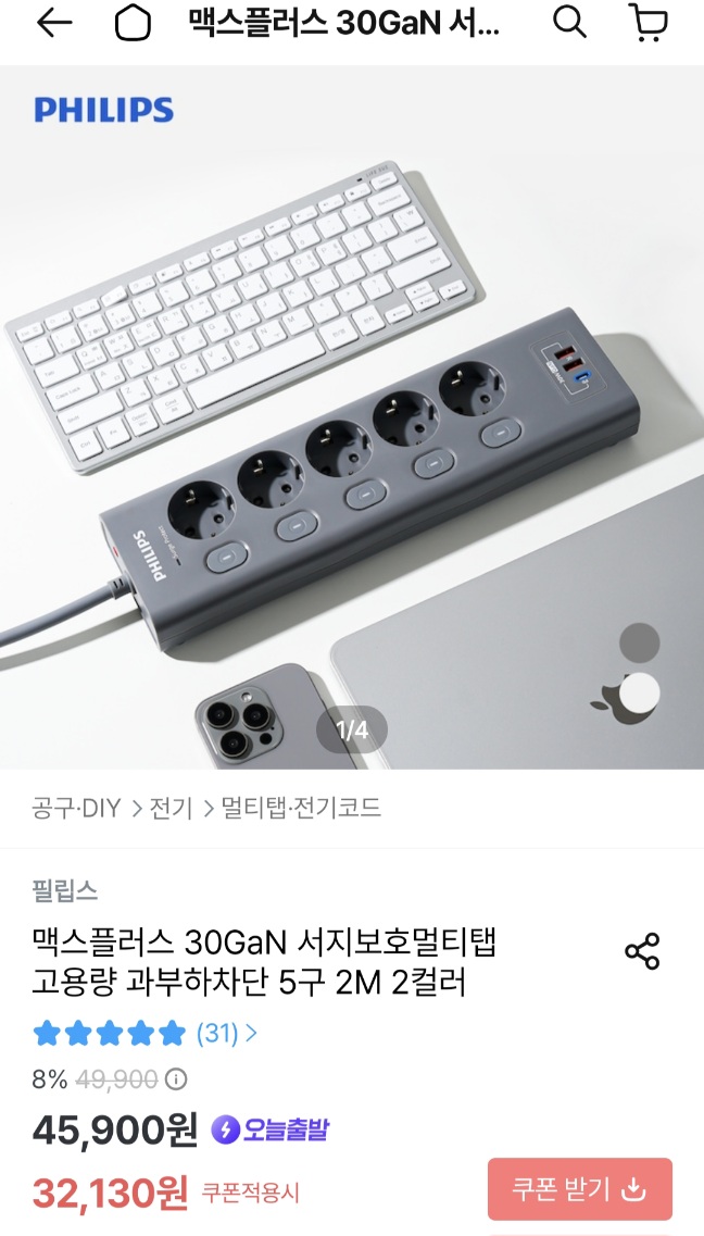 [기타] 필립스 맥스플러스 30Gan 서지보호 과부하 멀티탭 5구 2m
