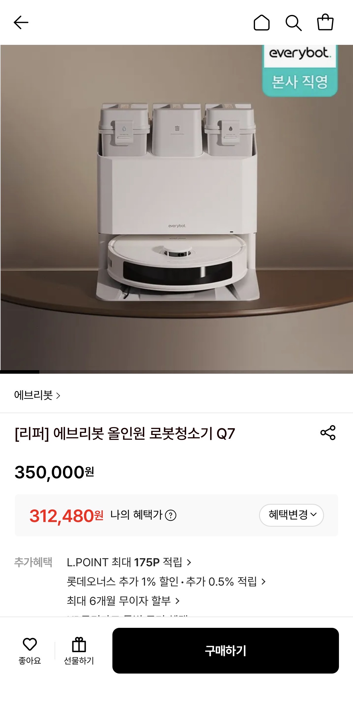 [롯데온] 에브리봇 올인원 로봇청소기 Q7 리퍼 (312,480원/무료)