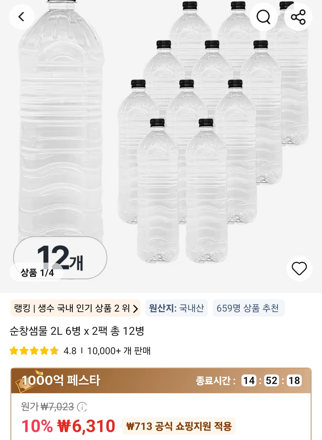 [알리] 순창샘물 2L 6병 x 2팩 총 12병
