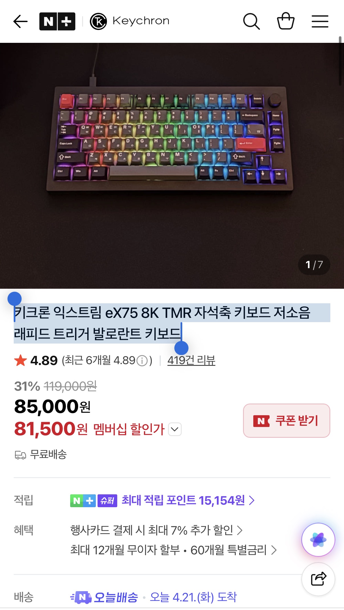 [네이버] 키크론 익스트림 eX75 8K TMR 자석축 키보드