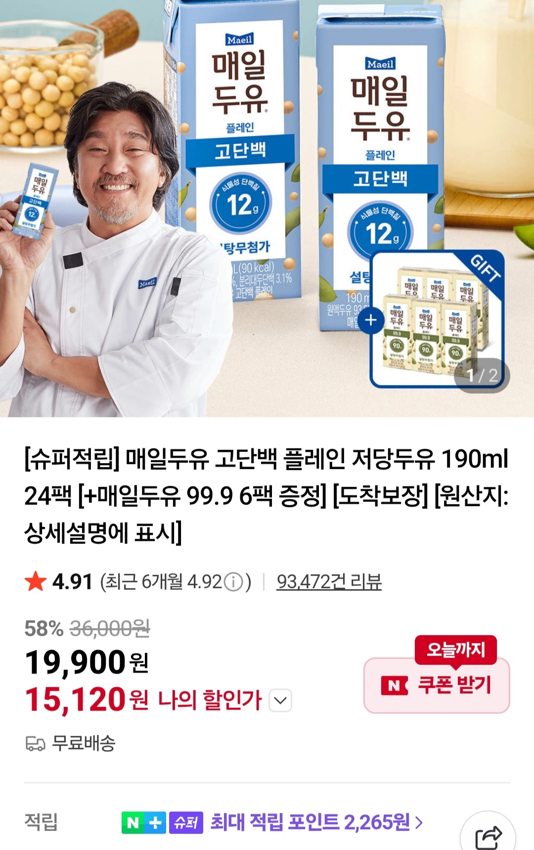 [네이버]매일 고단백저당두유 190ml 24팩+99.9 6팩(15,120...