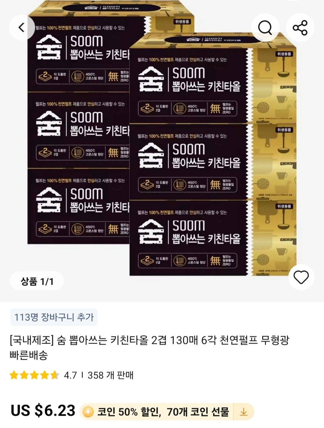 [알리]깨끗한나라 데일리 키친타올 150매 8롤 1팩(3,529원)/무배