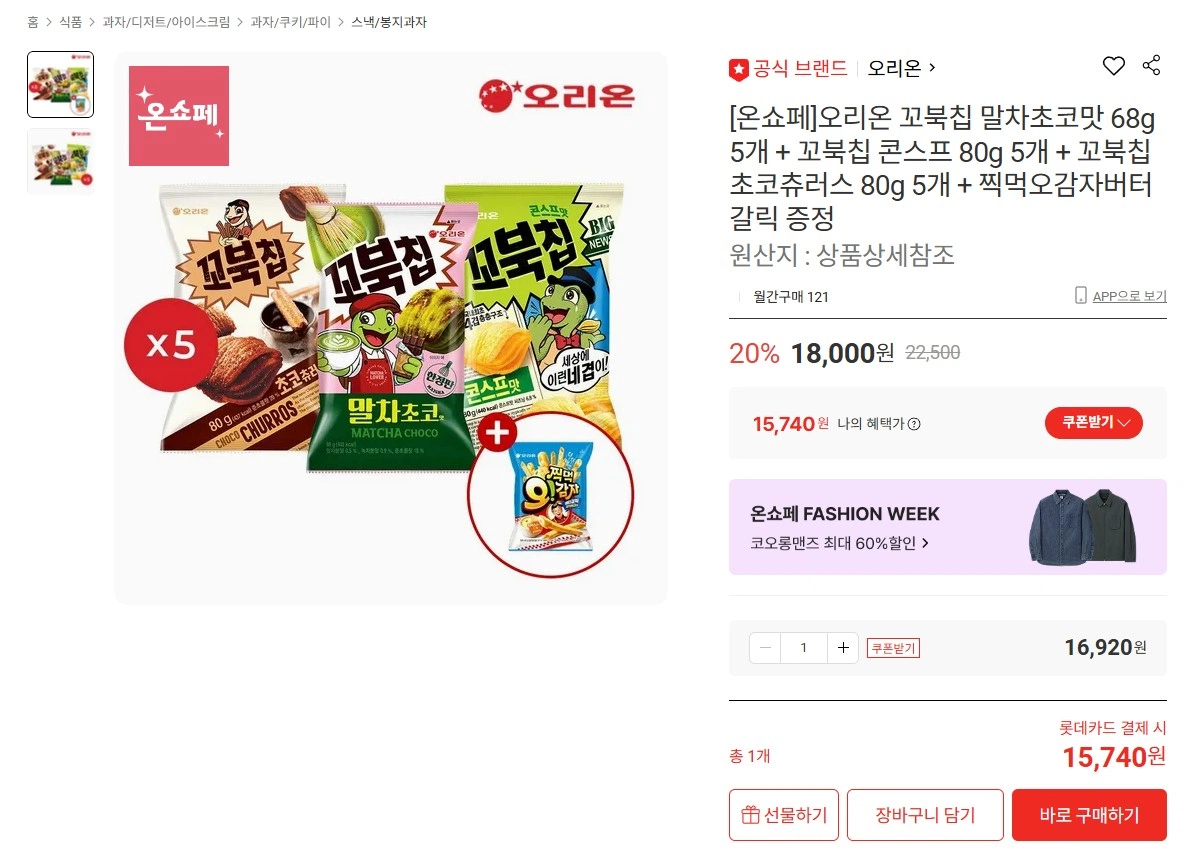 [롯데온] 꼬북칩 3종 총 15개 (카드15,740원 / 무배)